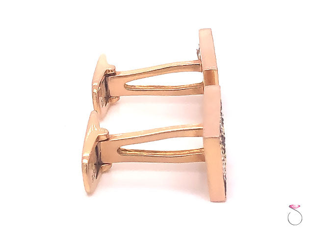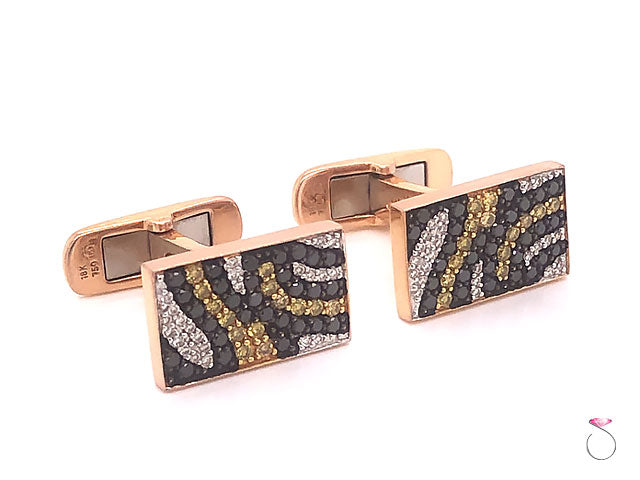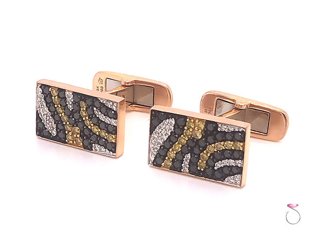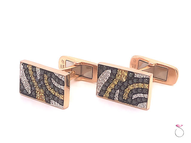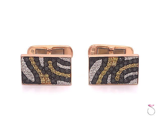Stunning designer multi color diamond cufflinks in tiger print. These cufflinks are very well crafted in 18k rose gold and set with white, yellow and black diamonds in a tiger print design. The front of each cufflink measure 16.10 mm x 9.70 mm. A total of 46 white round diamonds, 28 round fancy intense yellow diamonds and 56 round black diamonds are Pave' set on this cufflink set. The total diamond weight is approximately 1.50 carats. The white diamonds are G in color, and SI1 in clarity. The backs of the cufflinks are rectangular in shape and foldable. This is a beautifully designed pair of cufflinks that you can enjoy with elegance and style. These are new cufflinks in excellent condition. Hallmarked & Stamped "750" "18K". Total weight 11.30 grams.