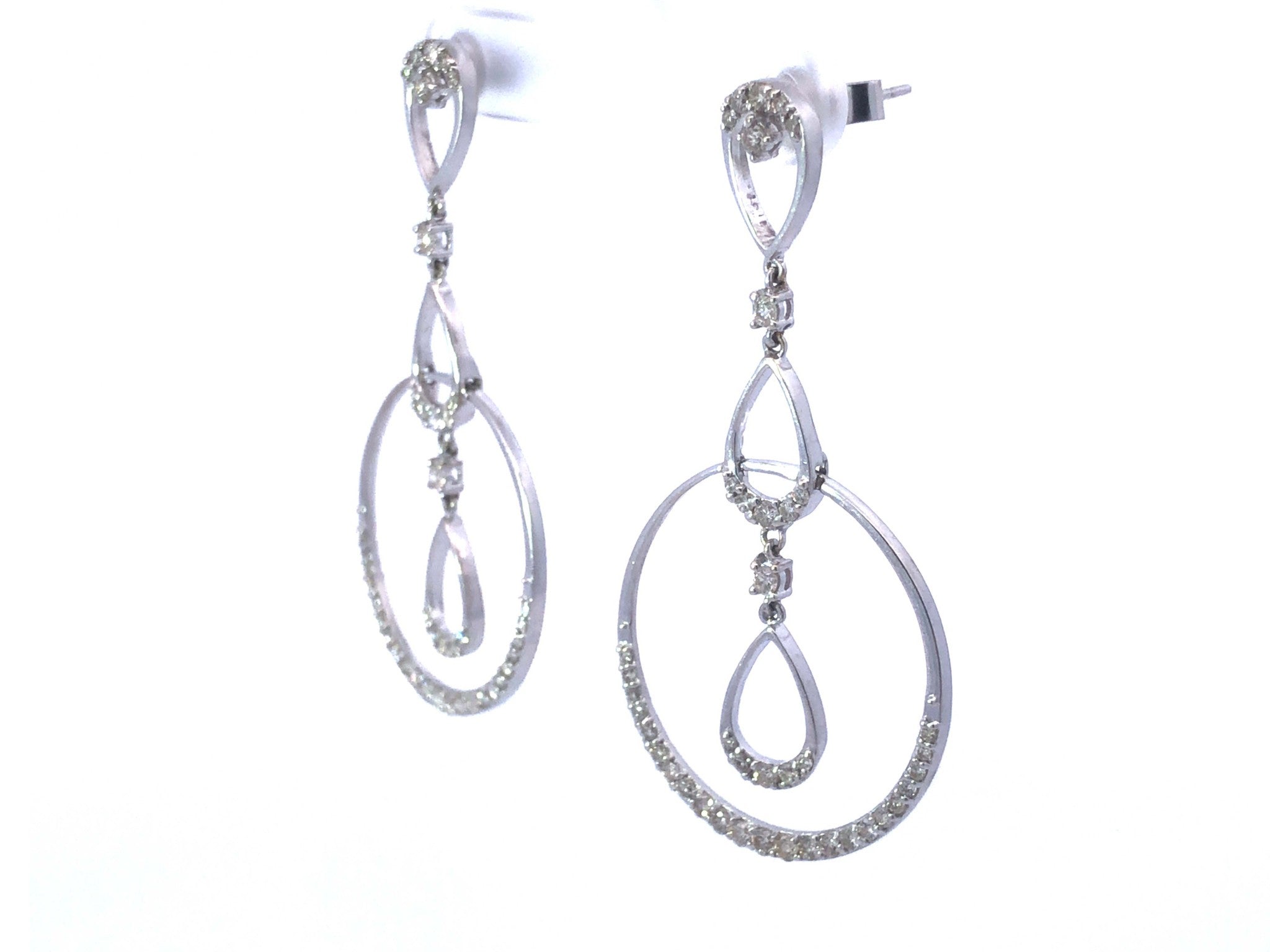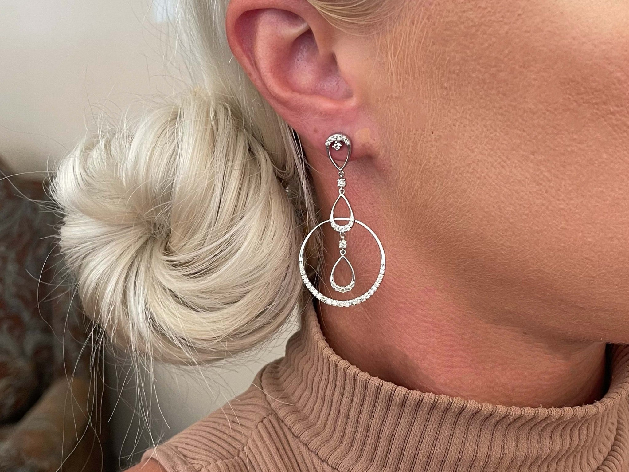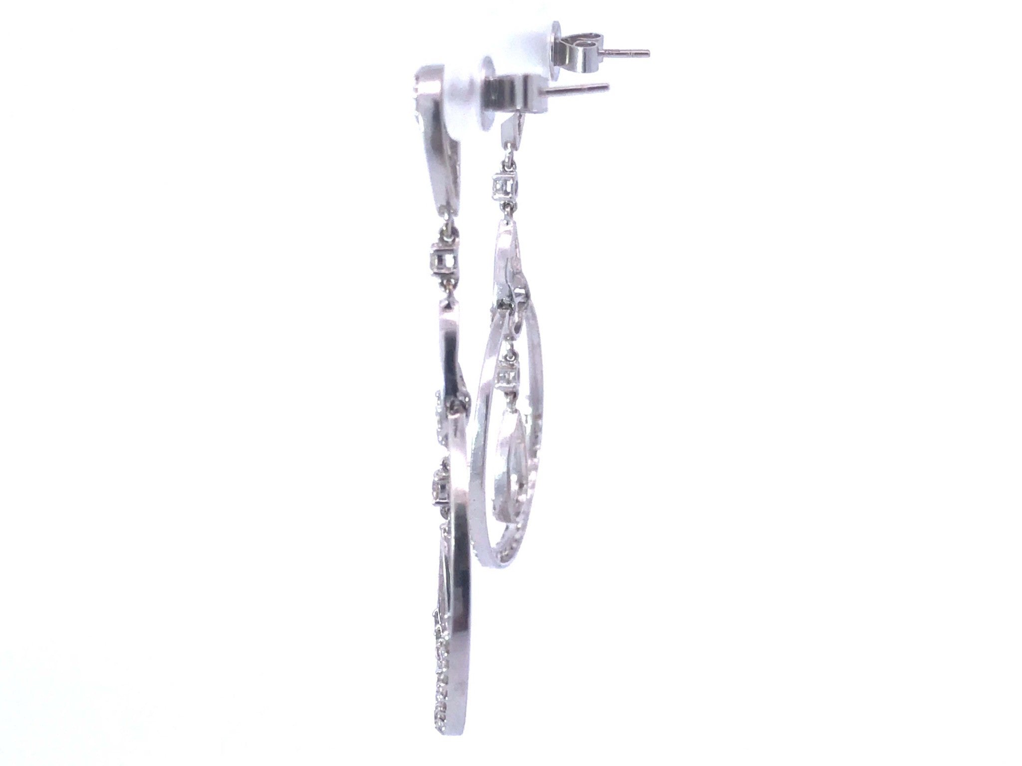 These decadent 18k white gold diamond drop earrings glisten with 2 carats of round brilliant diamonds, and sporting three separate drops, it is definitely a head turner! Each earring features 41 round brilliant cut diamonds creating endless sparkle. The diamonds are G-H in color and SI1 in clarity totaling approximately 2.00 carats. These magnificent earrings are approximately 27 mm in diameter, 2 inches in length and are stamped "18K". Total weight is 8 grams. Preowned in excellent condition.