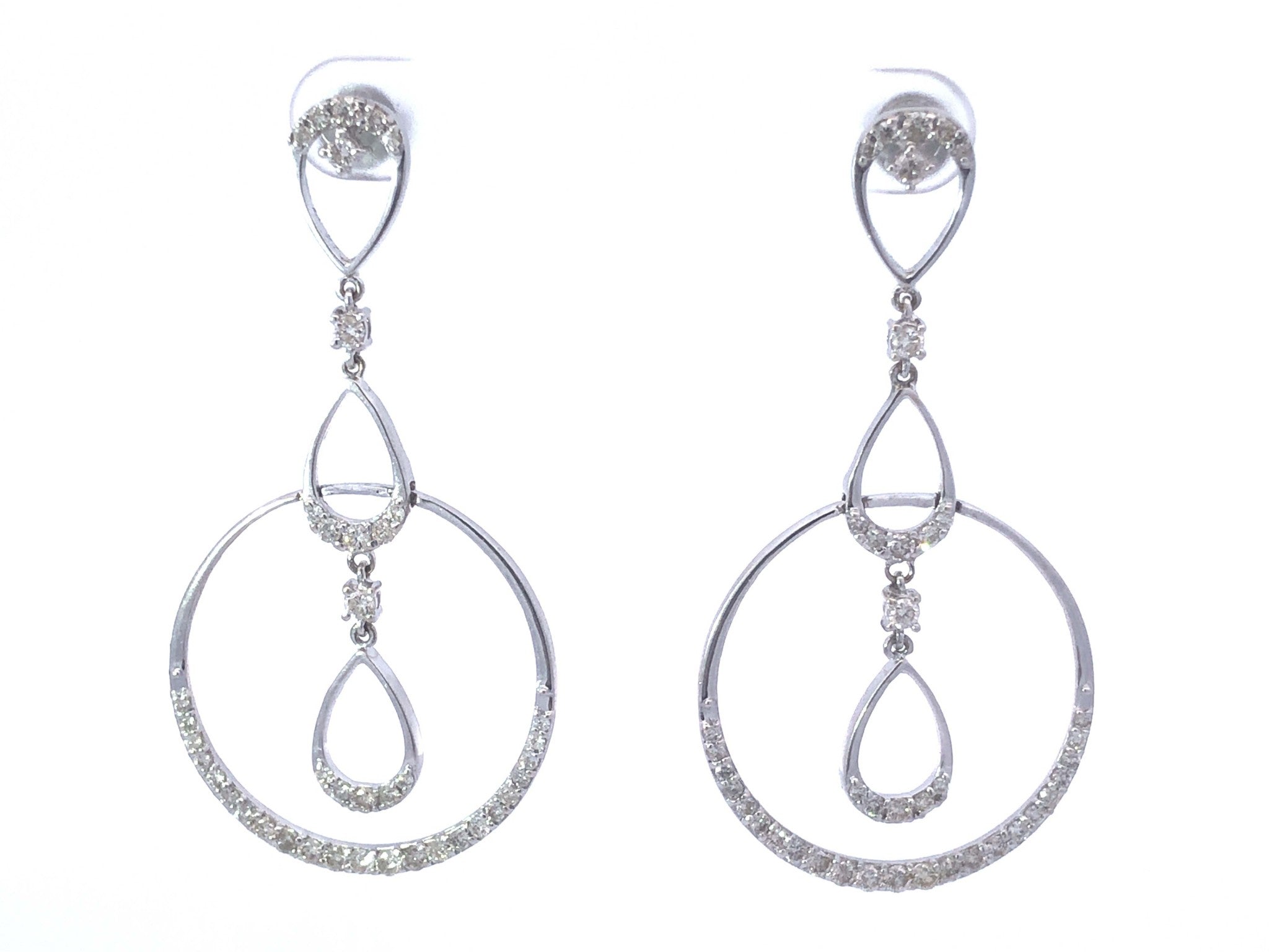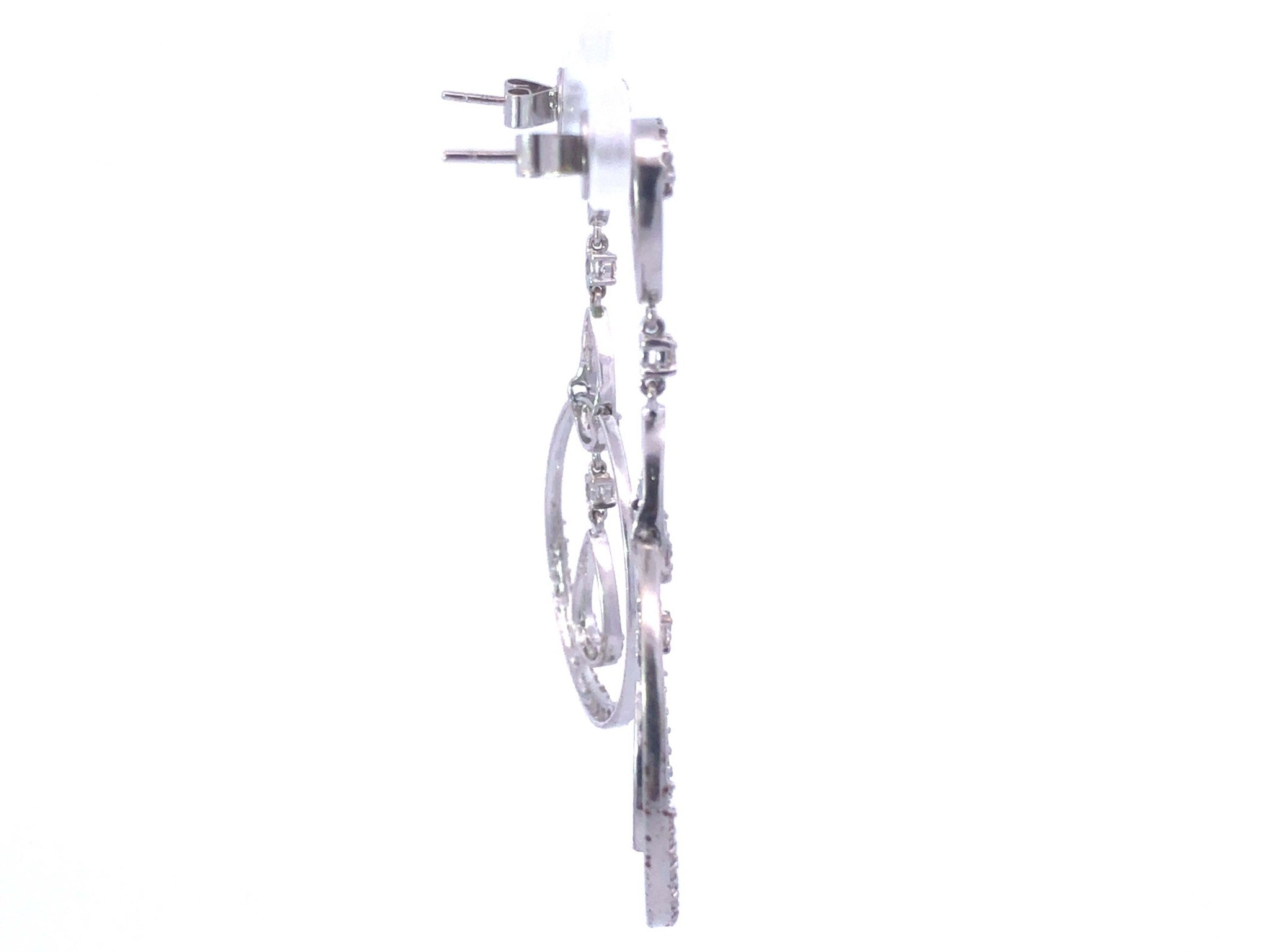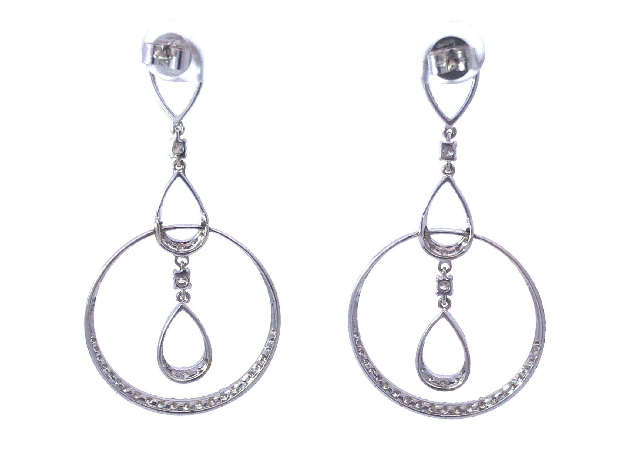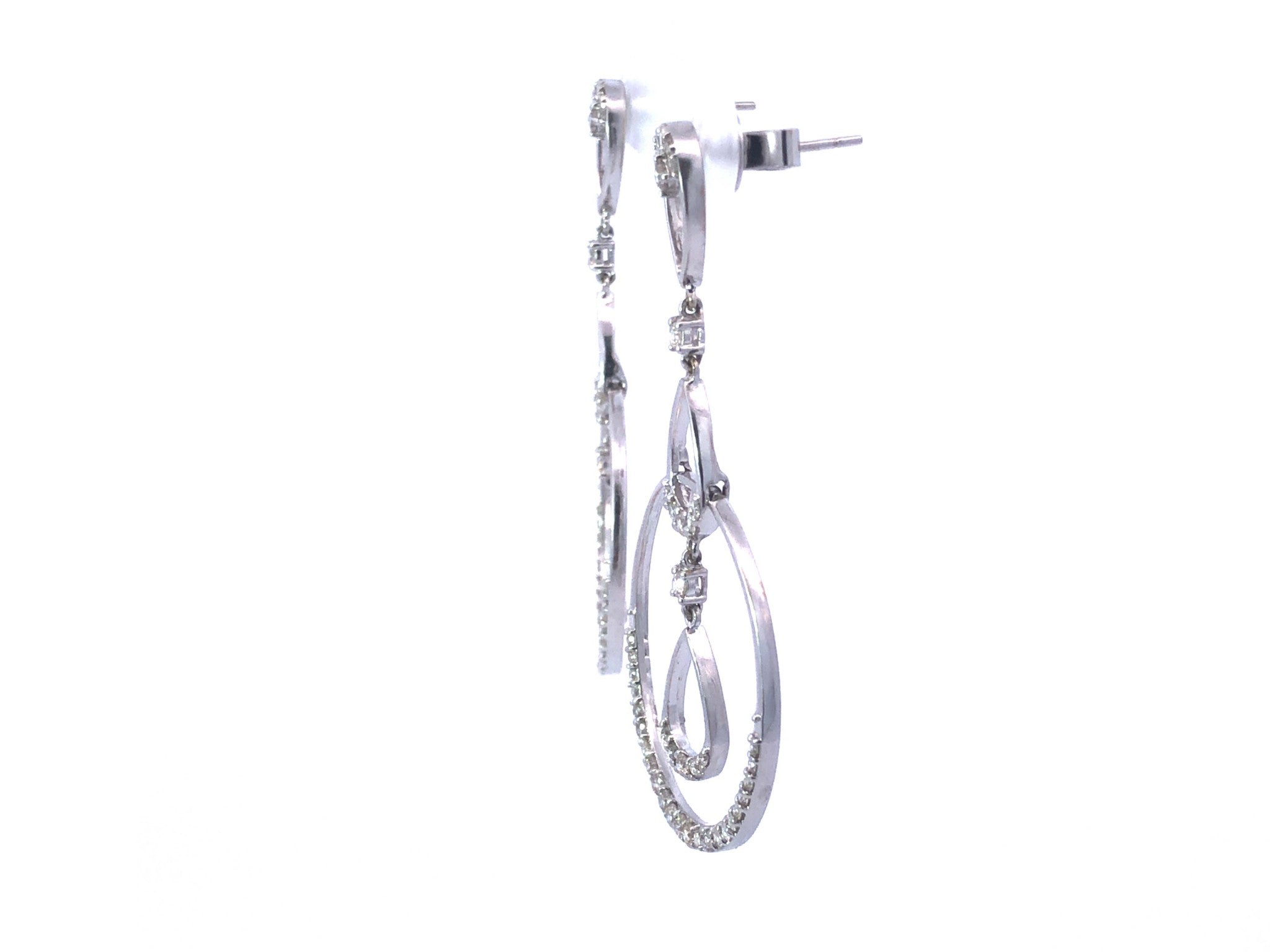 These decadent 18k white gold diamond drop earrings glisten with 2 carats of round brilliant diamonds, and sporting three separate drops, it is definitely a head turner! Each earring features 41 round brilliant cut diamonds creating endless sparkle. The diamonds are G-H in color and SI1 in clarity totaling approximately 2.00 carats. These magnificent earrings are approximately 27 mm in diameter, 2 inches in length and are stamped "18K". Total weight is 8 grams. Preowned in excellent condition.