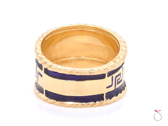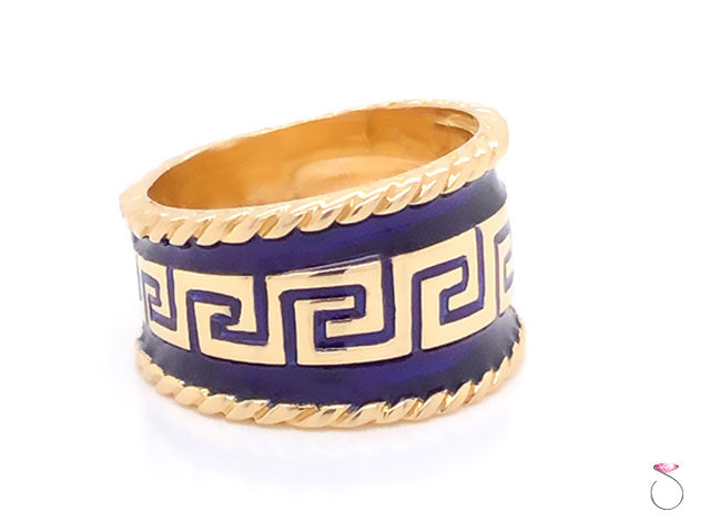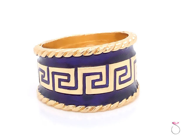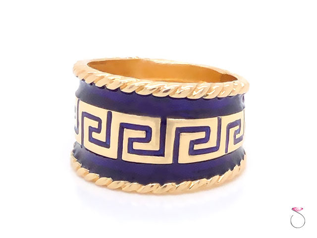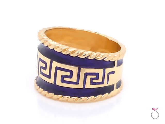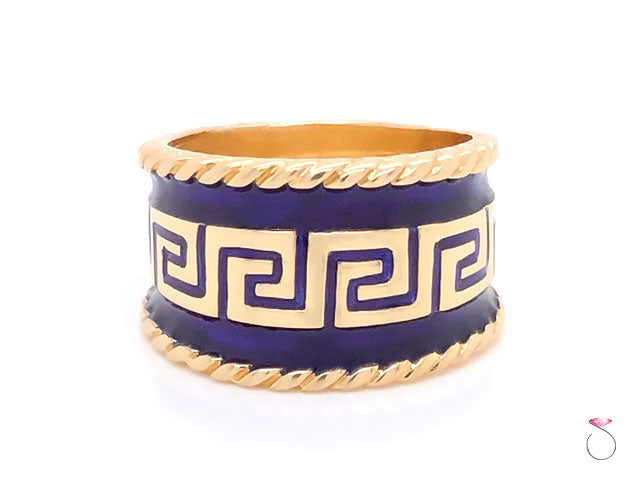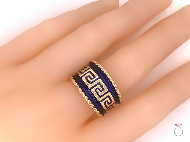 Stunning vintage enamel wide cigar ring by MAZ. The ring is beautifully crafted in 14K yellow gold and feature bluie enamel with Greek key design. The enamel on the ring is in excellent condition with no damage. This wide cigar ring measures 15mm wide. The ring is stamped "14K" and Hallmarked "MAZ" on the inside. This is a rare ring that would make a great addition to any collection as well as everyday use. This is a vintage ring in excellent condition. The Ring is size 9 and can be easily resized for a fee. Total weight is 10.00 grams.