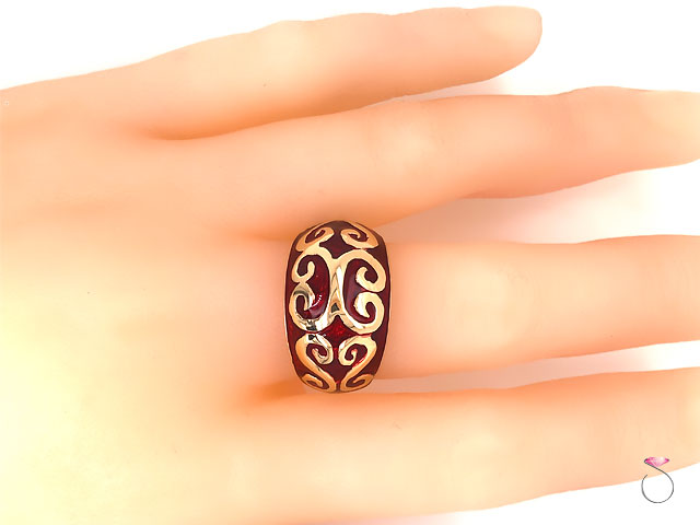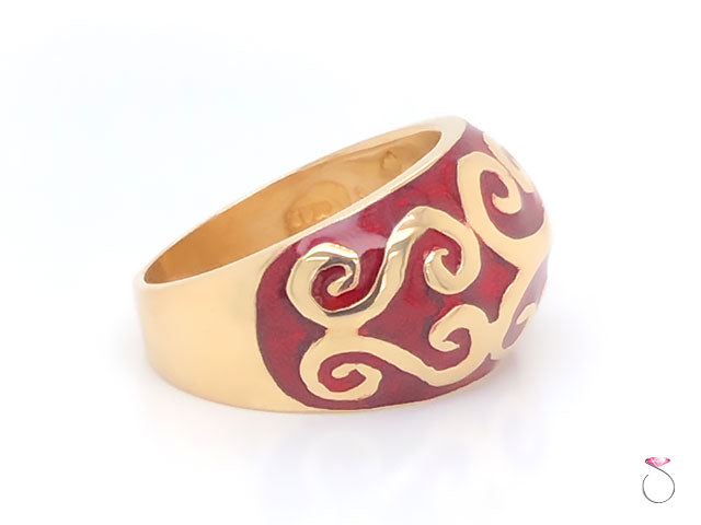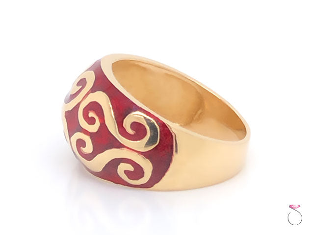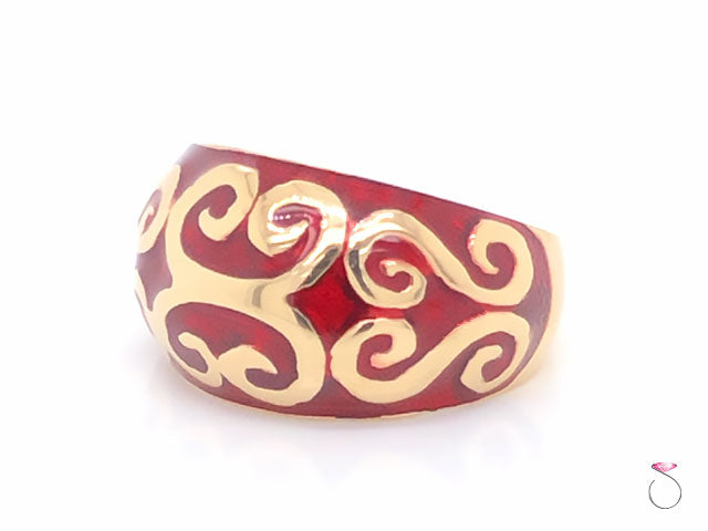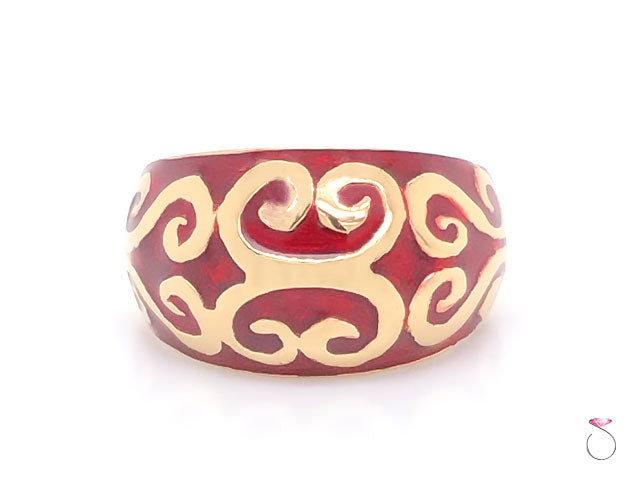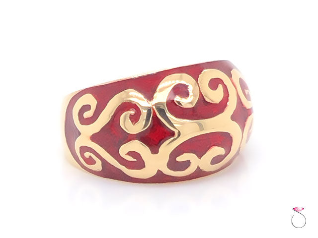 Stunning vintage enamel large dome ring my MAZ. The ring is beautifully crafted in 14K yellow gold and feature red enamel with gold swirl designs. The enamel on the ring is in excellent condition with no damage. This dome ring measures 12mm wide and 5mm high. The ring is stamped "14K" and Hallmarked "MAZ" on the inside. This is a rare ring that would make a great addition to any collection and everyday use. This is a vintage ring in excellent condition. The Ring is size 8 and can be easily resized for a fee. Total weight is 9.60 grams.
