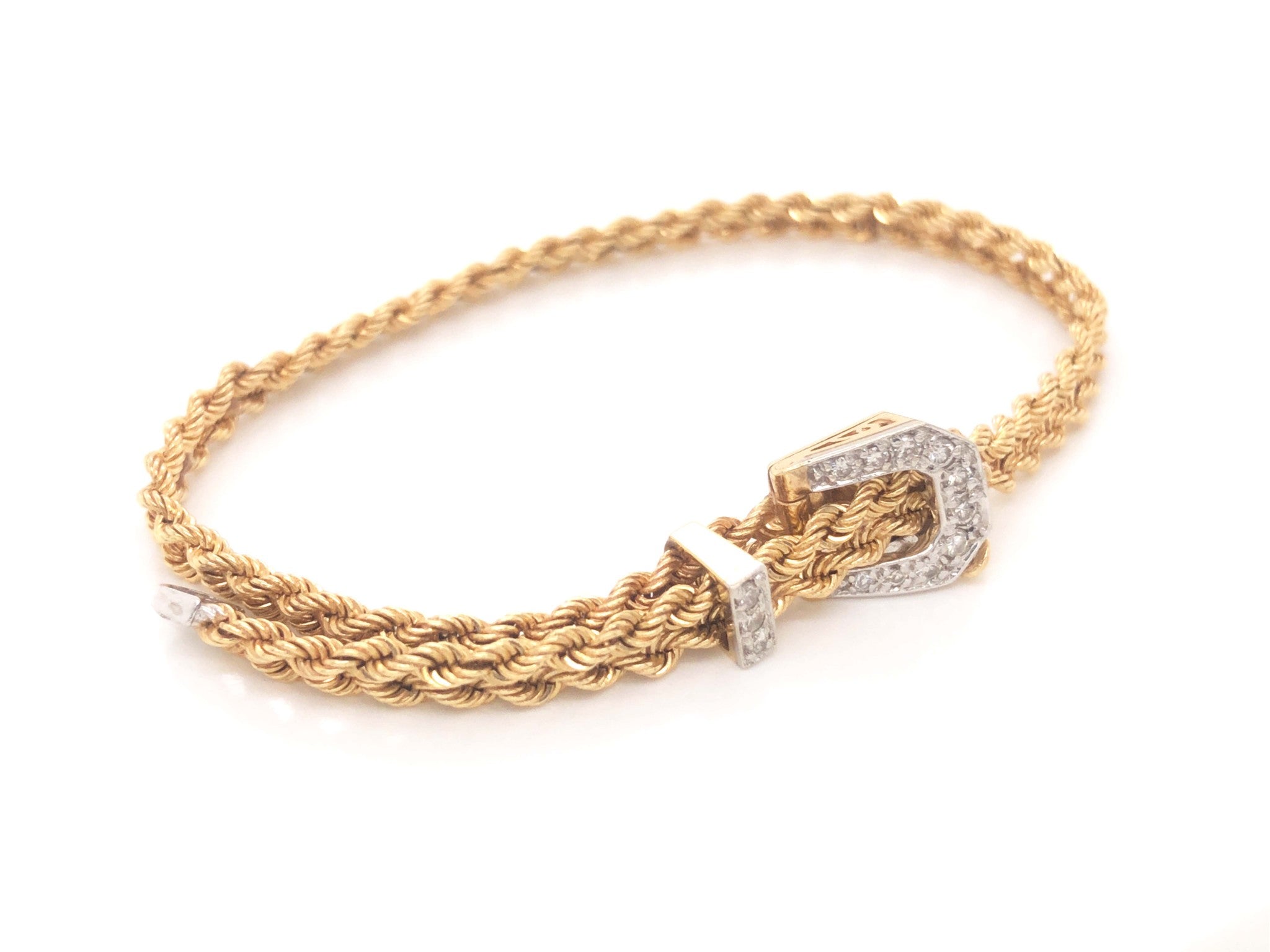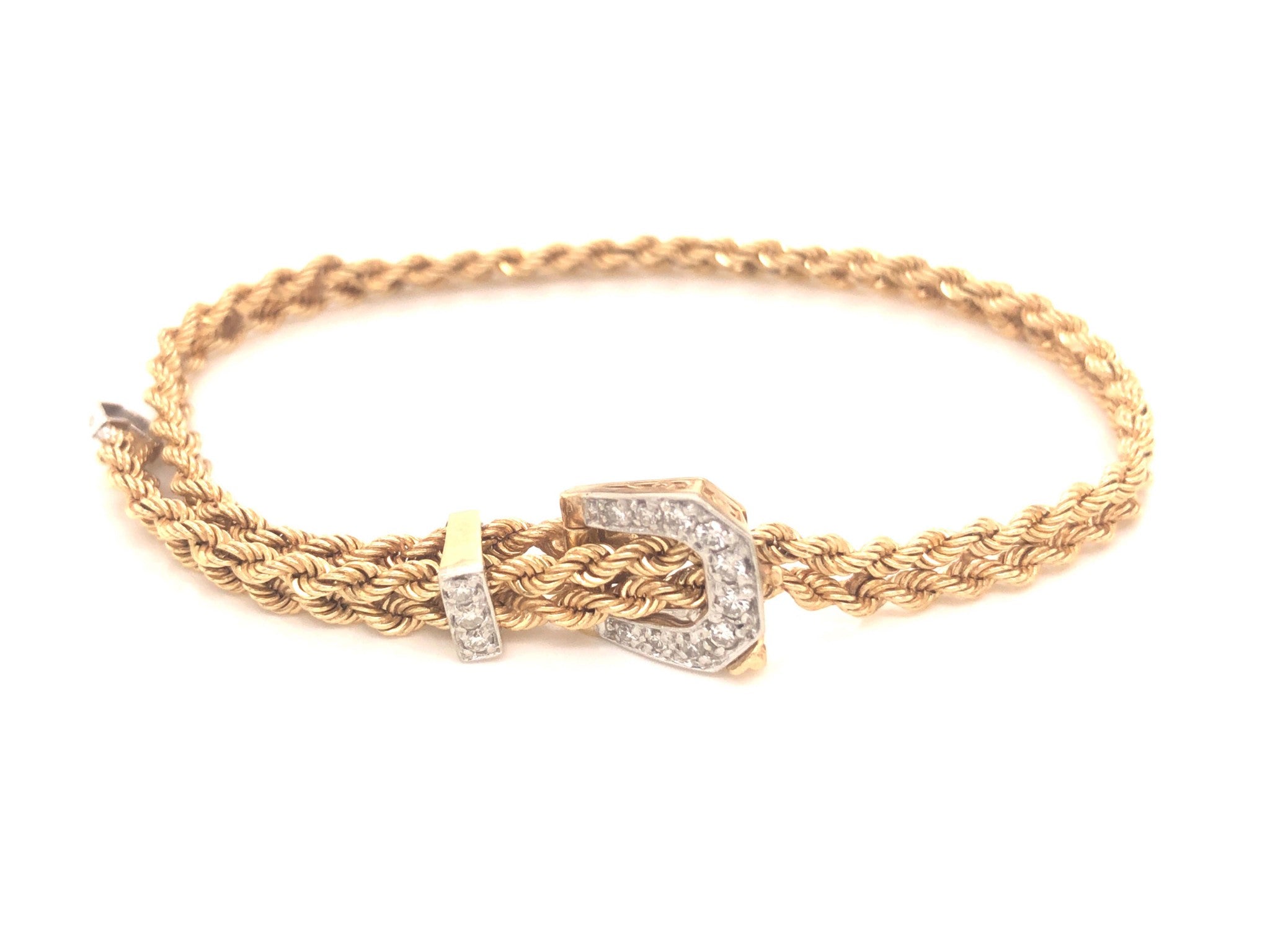 Vintage Diamond Belt Double Rope Bracelet in 14k Yellow Gold. This unique bracelet works just like a belt, tightening by putting the bracelet through the belt buckle. The parts of the buckle are white gold set with a total of 15 diamonds, weighing a total of 0.15 carats, G-H in color and SI1 in clarity. The bracelet is adjustable and fits wrist size up to 7 inches and is 4.18 mm wide. The bracelet is stamped "14k". It weighs 7.8 grams and is vintage in excellent condition.