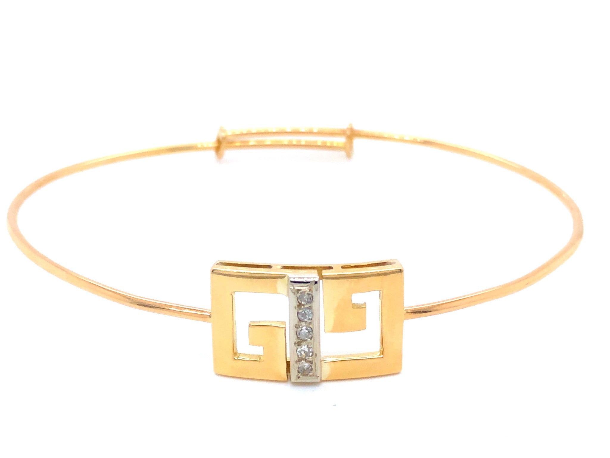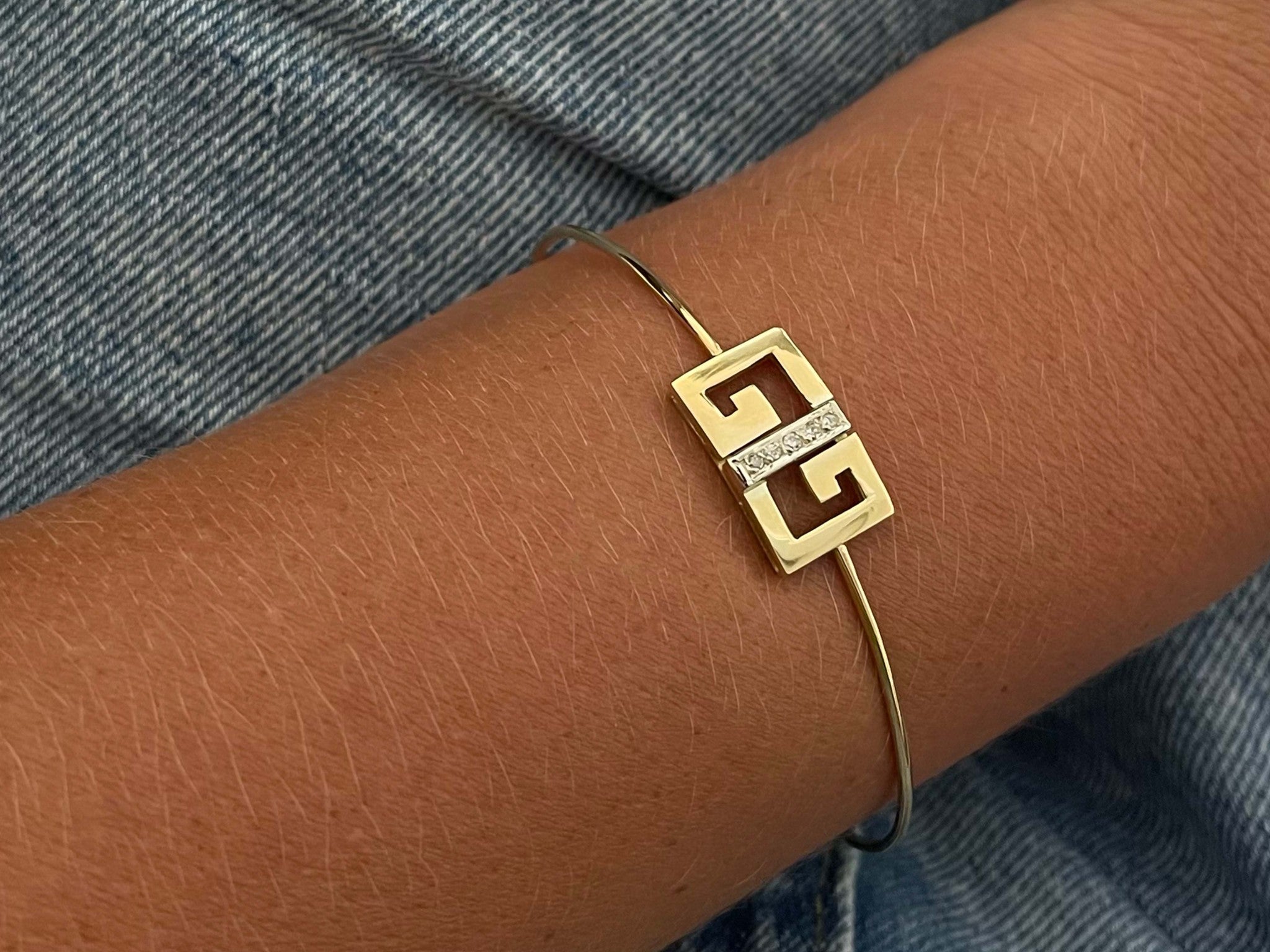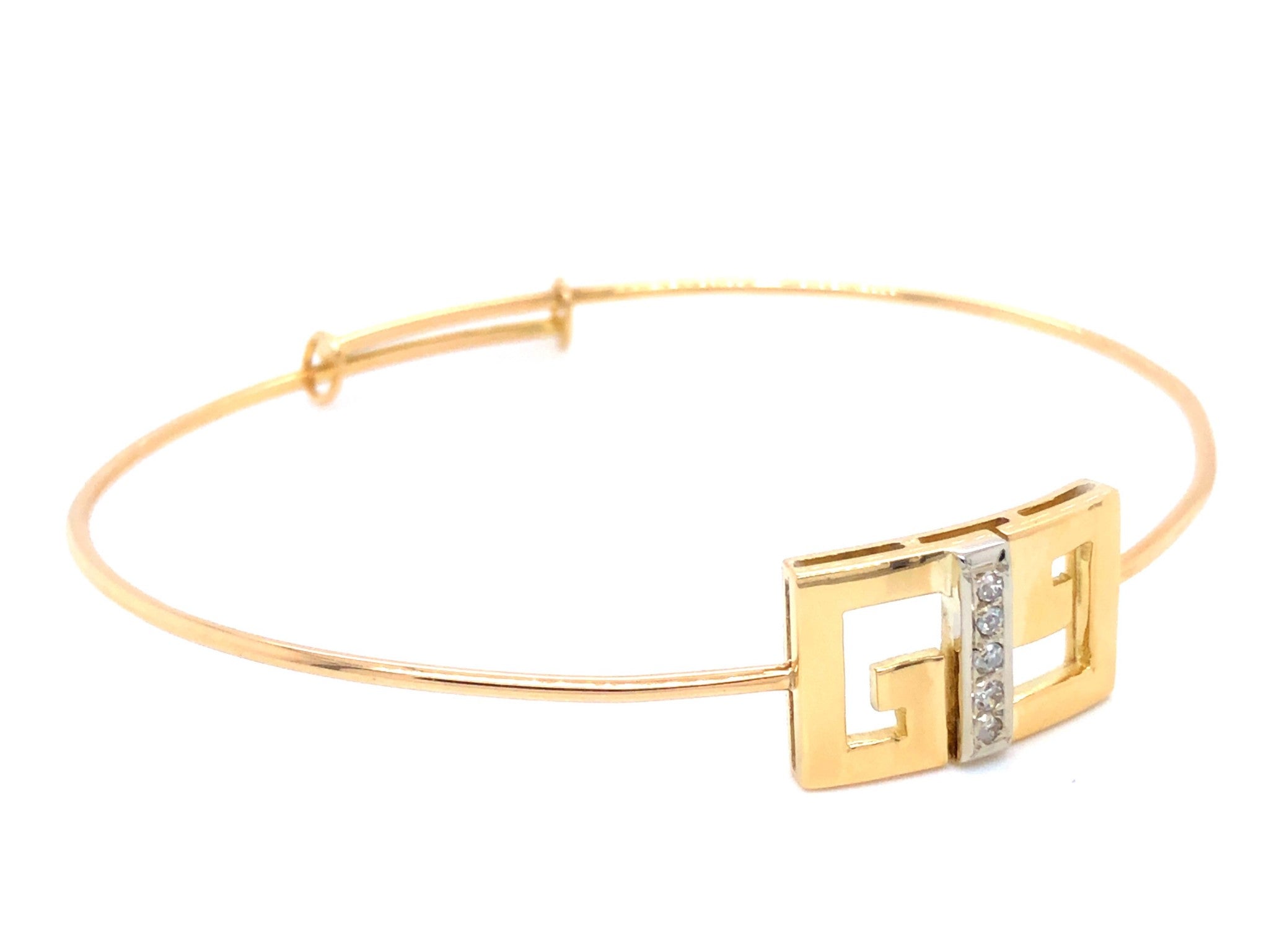 This 1970's Gucci bracelet is from the Gucci Logo Collection and is a piece that takes you back in time. Gucci's signature logo GG is connected by a row of 5 round diamonds set vertically. These round diamonds total 0.05 carats and are I-J in color and I1 in clarity. The bracelet is crafted in 18k yellow gold. The bracelet measures 2.5" across and expands up to 2.75". Bracelet total weighs is 8 grams. The bracelet is hallmarked "Gucci" and stamped "Italy" "750". The bracelet is vintage in excellent condition and will arrive like new as it was just polished in house!
