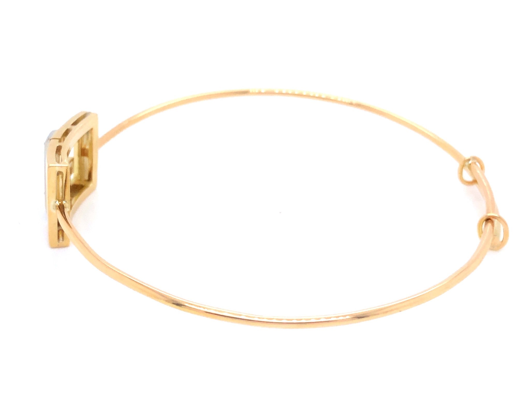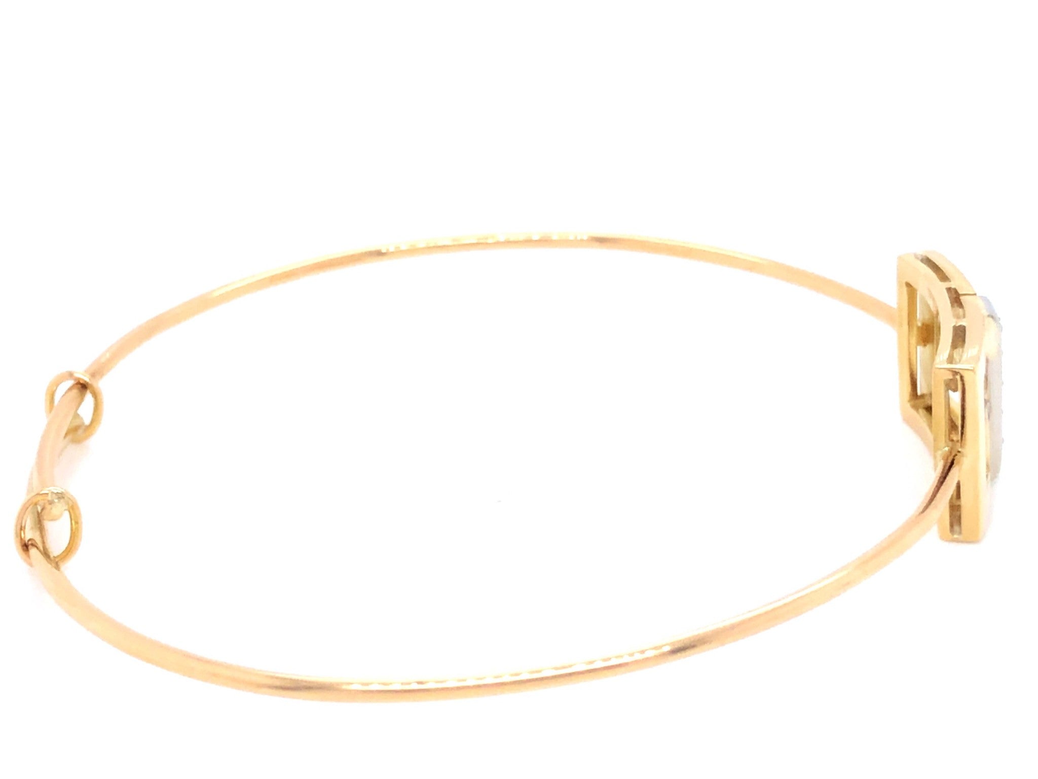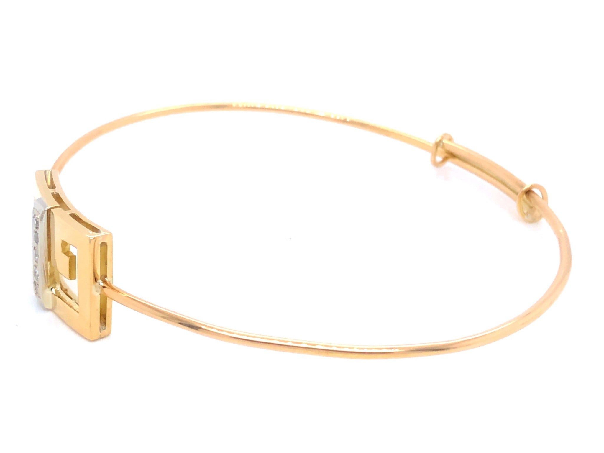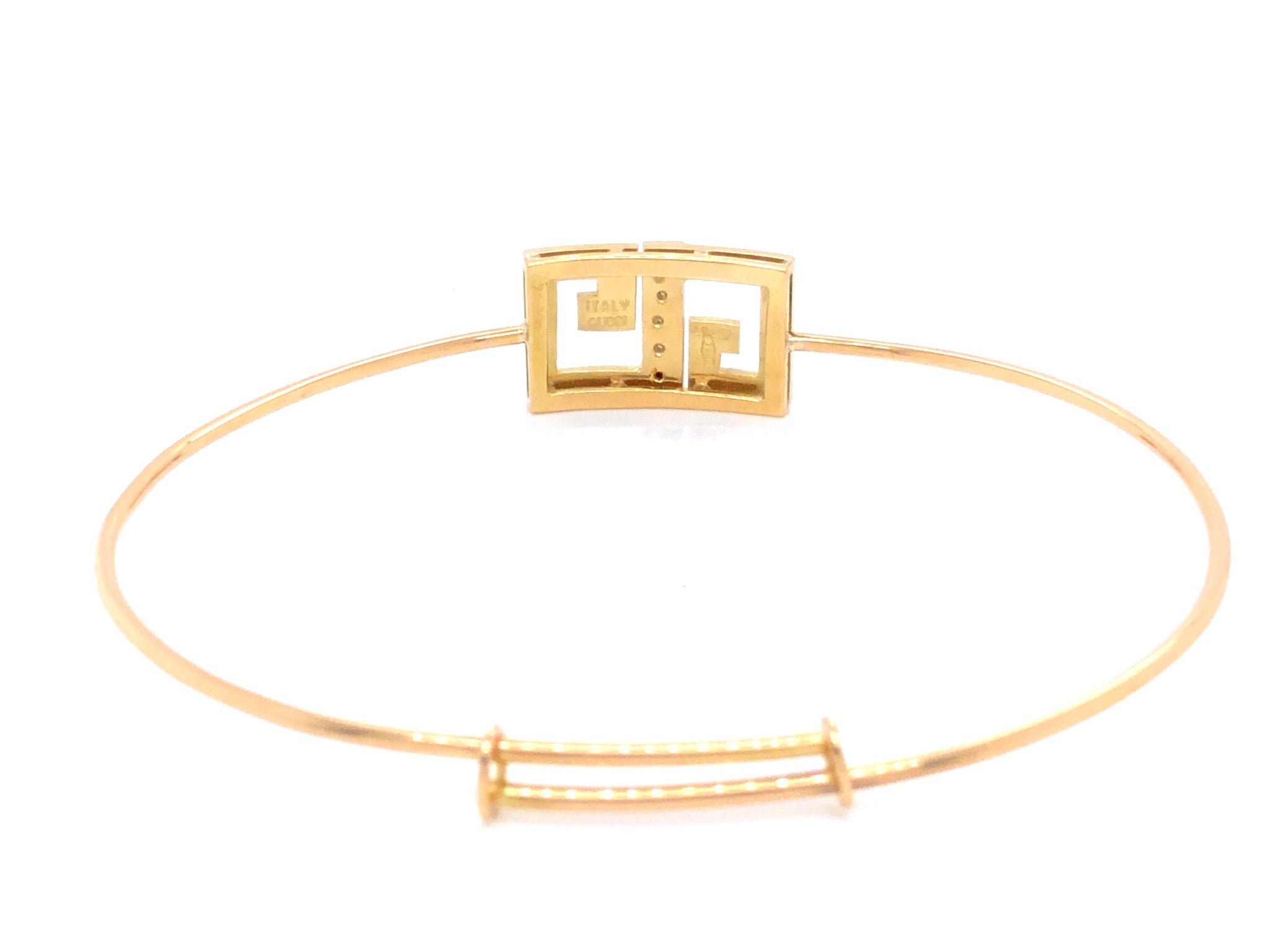 This 1970's Gucci bracelet is from the Gucci Logo Collection and is a piece that takes you back in time. Gucci's signature logo GG is connected by a row of 5 round diamonds set vertically. These round diamonds total 0.05 carats and are I-J in color and I1 in clarity. The bracelet is crafted in 18k yellow gold. The bracelet measures 2.5" across and expands up to 2.75". Bracelet total weighs is 8 grams. The bracelet is hallmarked "Gucci" and stamped "Italy" "750". The bracelet is vintage in excellent condition and will arrive like new as it was just polished in house!