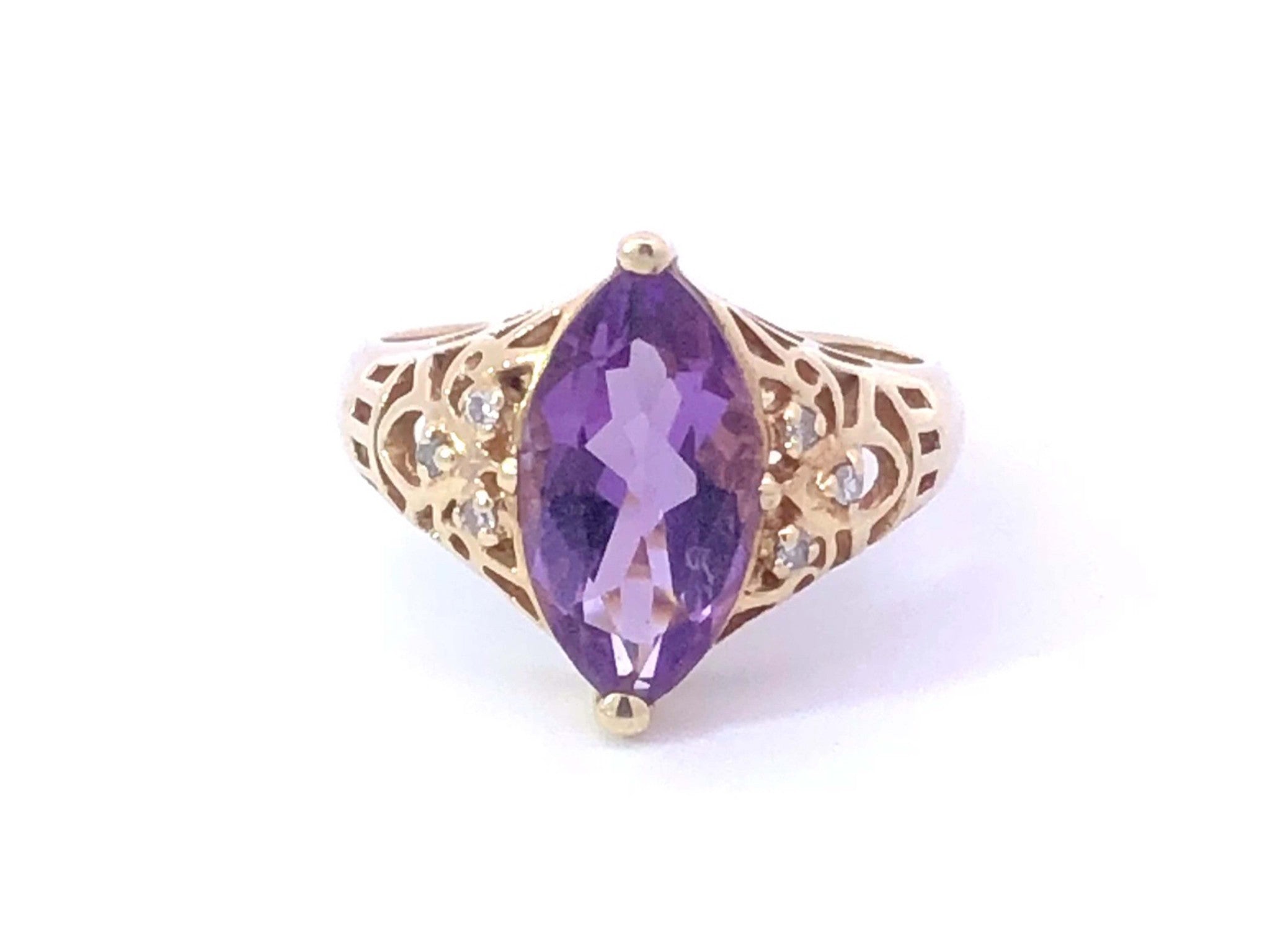 Vintage Marquise Amethyst & Diamond Ring in 14K Yellow Gold. This unique ring features a marquise cut purple Amethyst center gemstone with brilliant faceting. The Amethyst measures approximately 15 mm x 7 mm with an estimated weight of 2.00 carats. The vibrant deep purple Amethyst is prong set. The shoulders are set with 6 diamonds, 3 on each side of the center stone. The diamonds are I-J in color and SI1 in clarity, totaling approximately 0.06 carats. The ring is size 8 and can be easily re-sized (resizing available for a fee). Hallmarked "PON" and stamped "14K" on the inside. Total weight is 4.8 grams. Vintage Ring in very good condition.