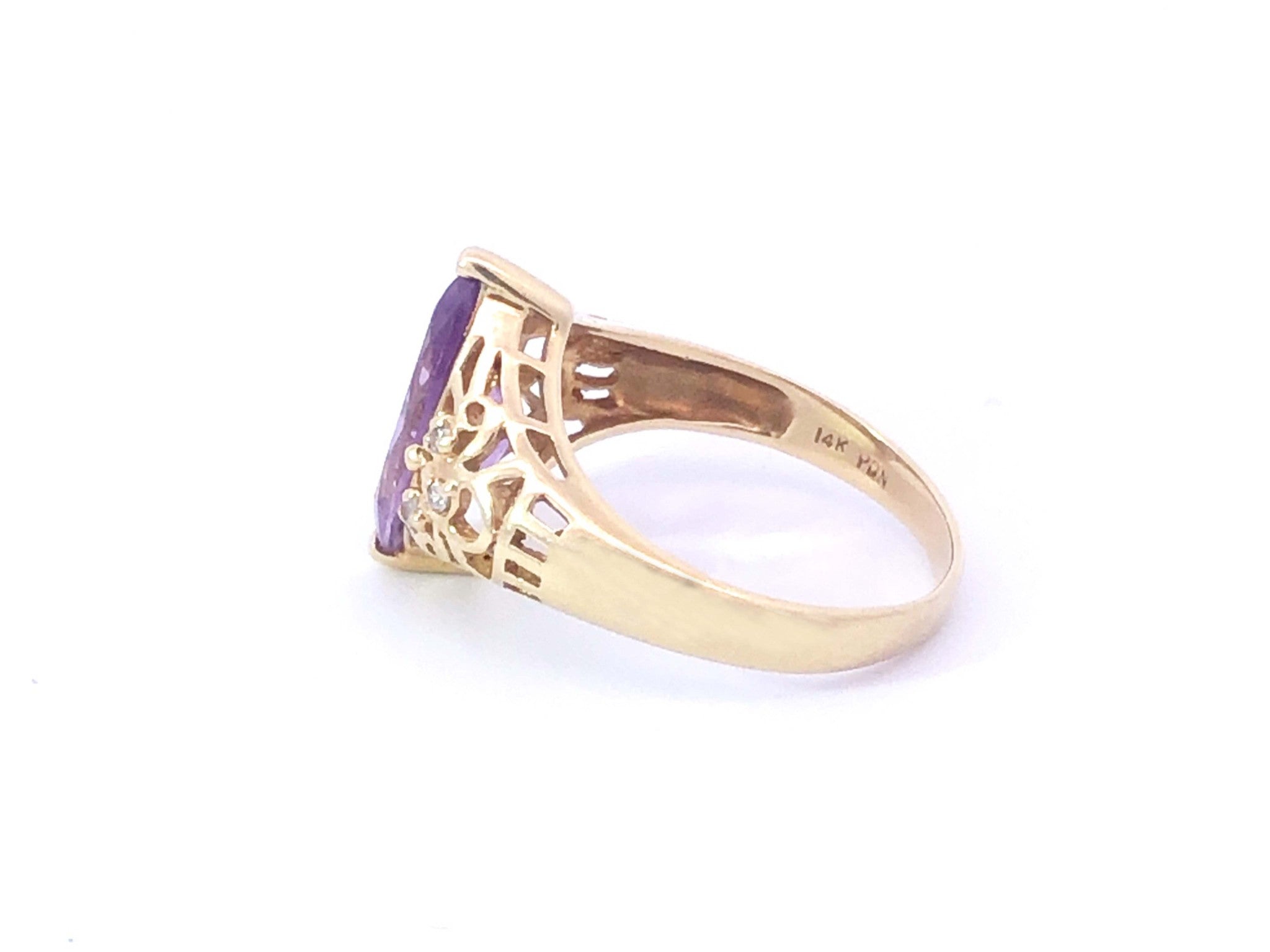 Vintage Marquise Amethyst & Diamond Ring in 14K Yellow Gold. This unique ring features a marquise cut purple Amethyst center gemstone with brilliant faceting. The Amethyst measures approximately 15 mm x 7 mm...