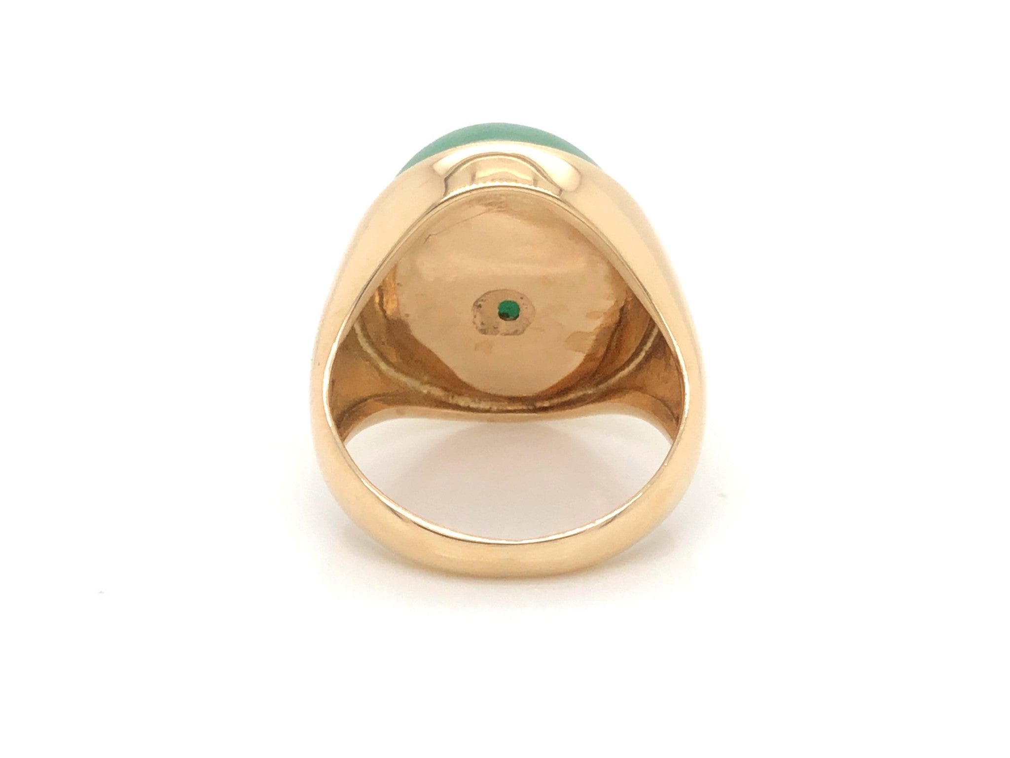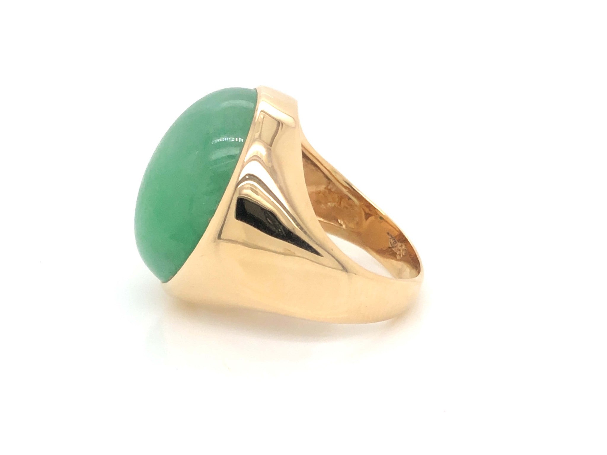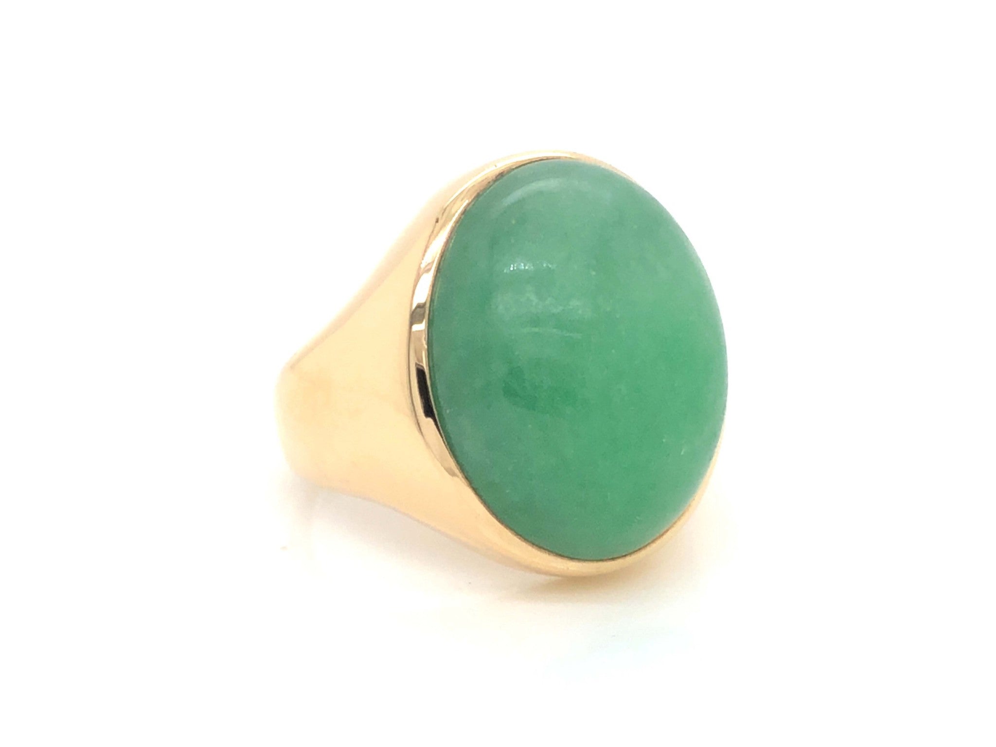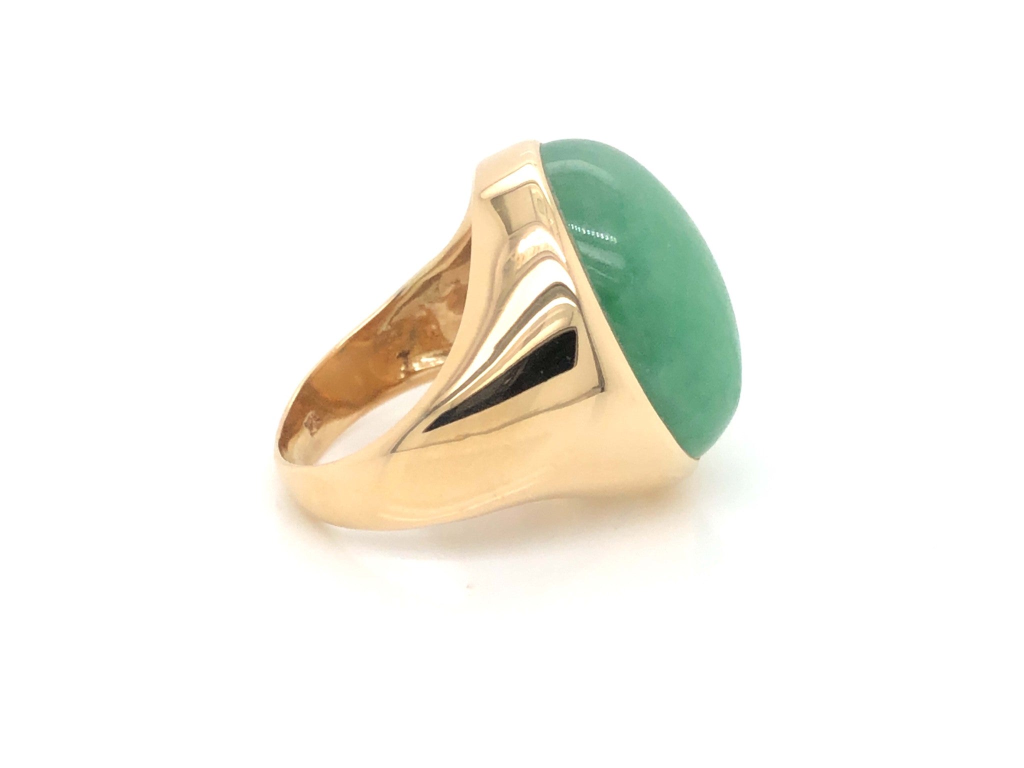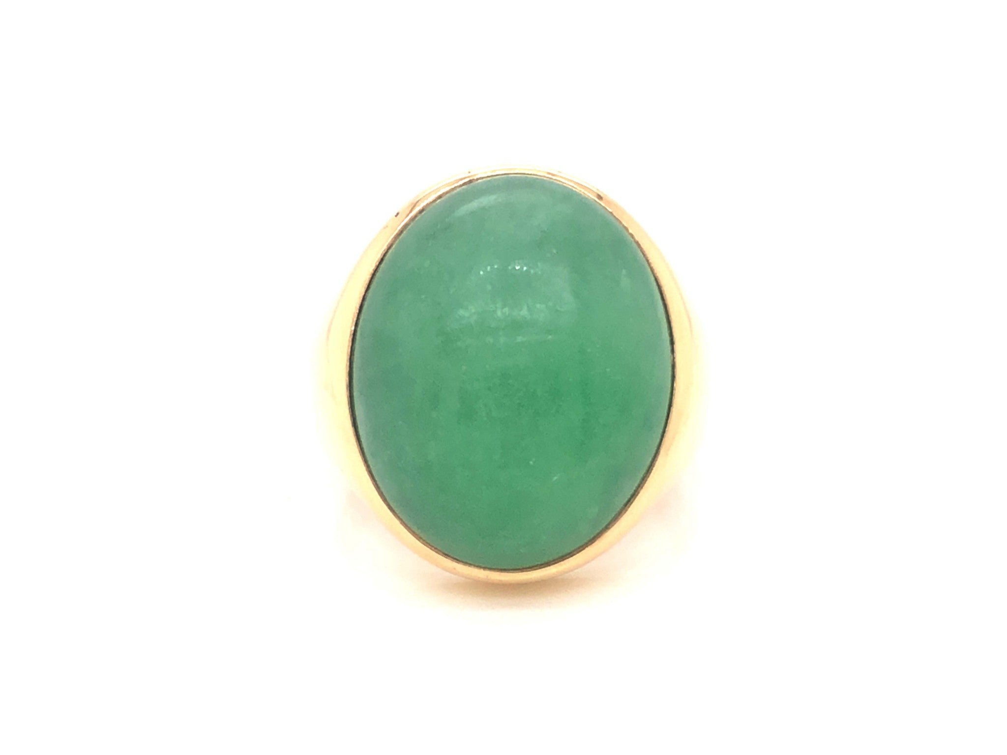 Magnificent vintage large oval cabochon green jadeite jade ring, in 14k yellow gold. The beautiful apple green Jade is bezel set and measures approximately 20.52 mm x 17.02 mm x 9.85 mm. The ring has a tapered shank with a high polish finish. The ring is size 7.5 and can be easily re-sized for a small fee. Stamped "14k" on the inside. Total weight is 12.7 grams. Preowned in very good condition.