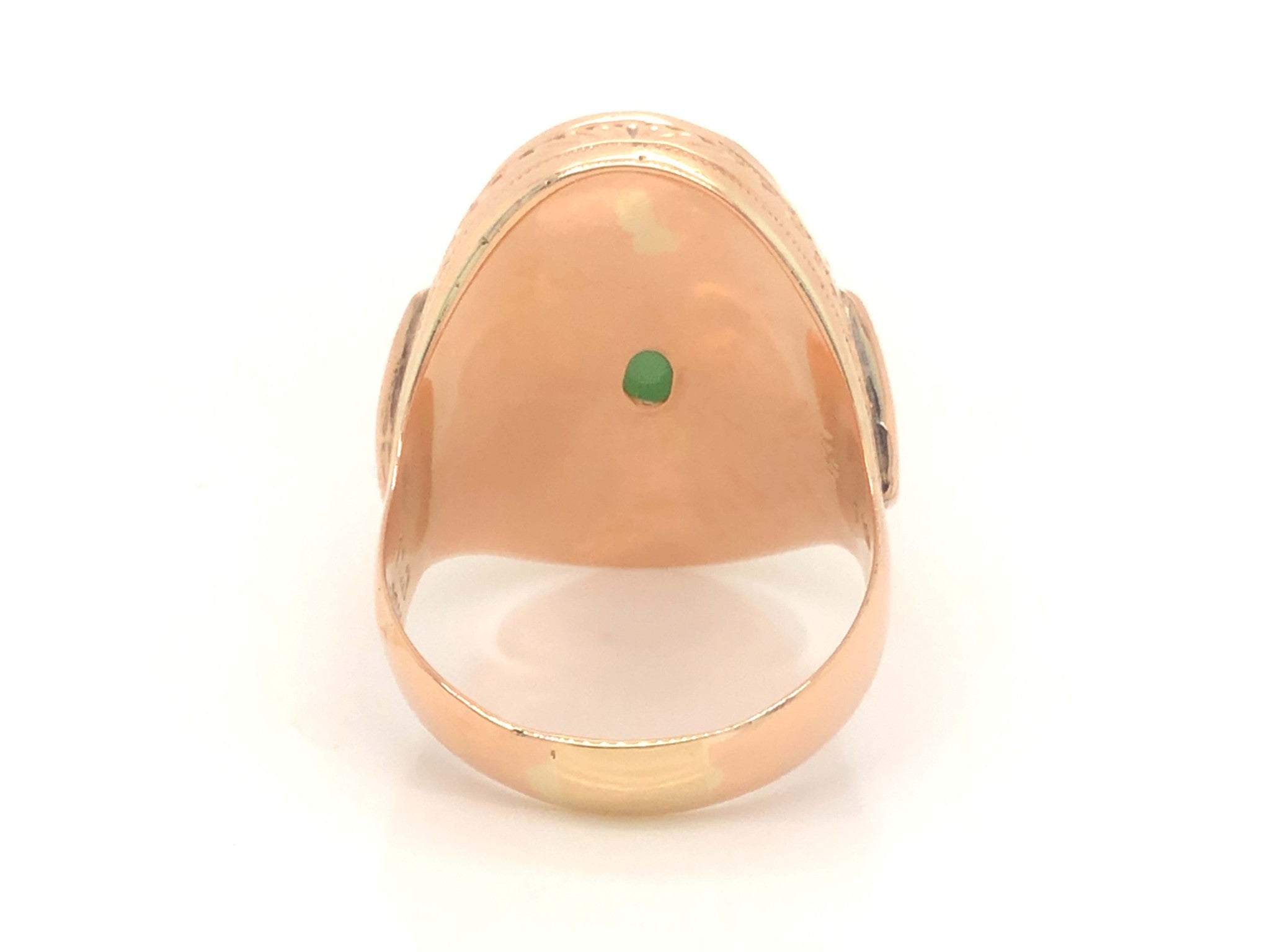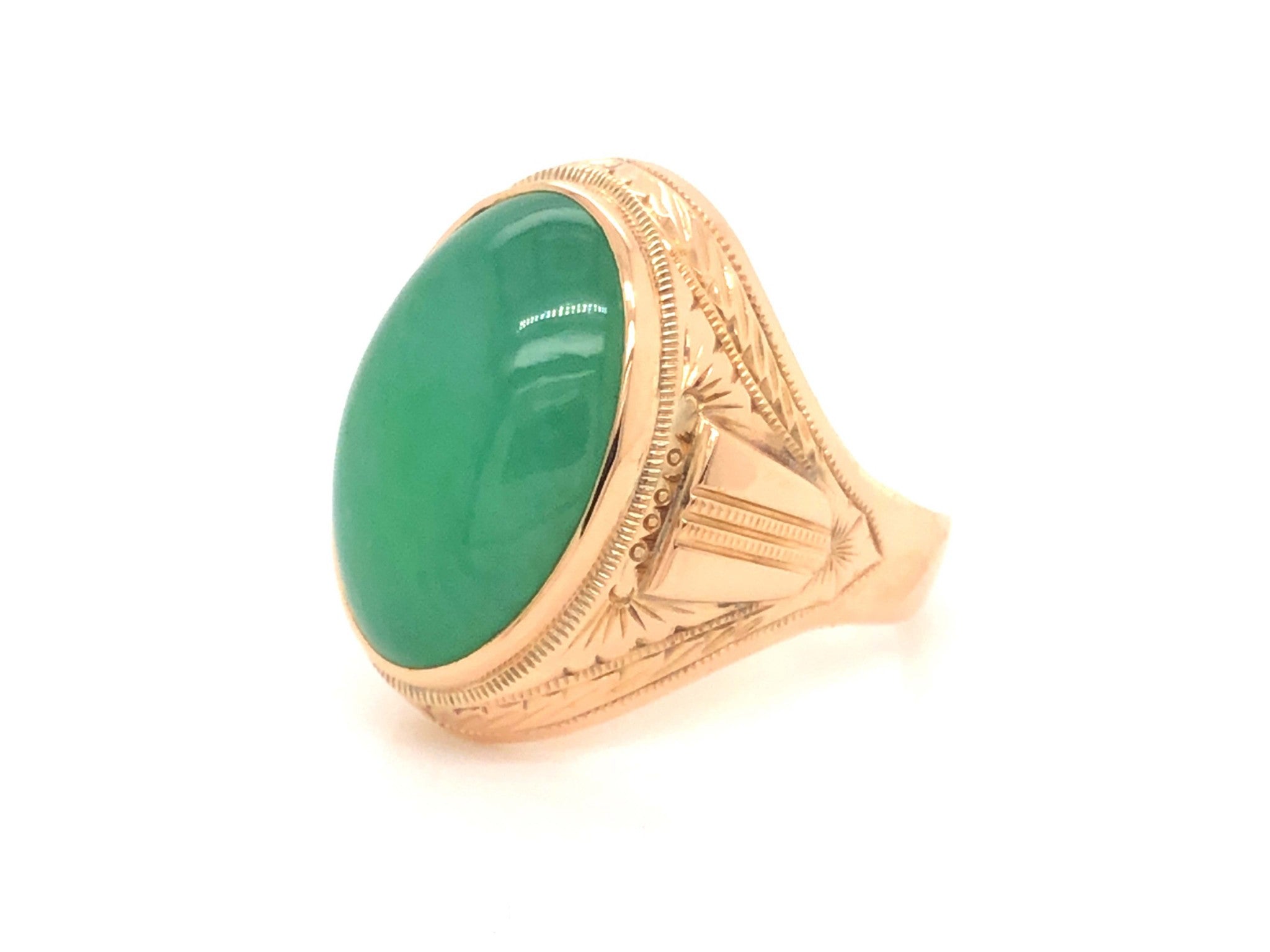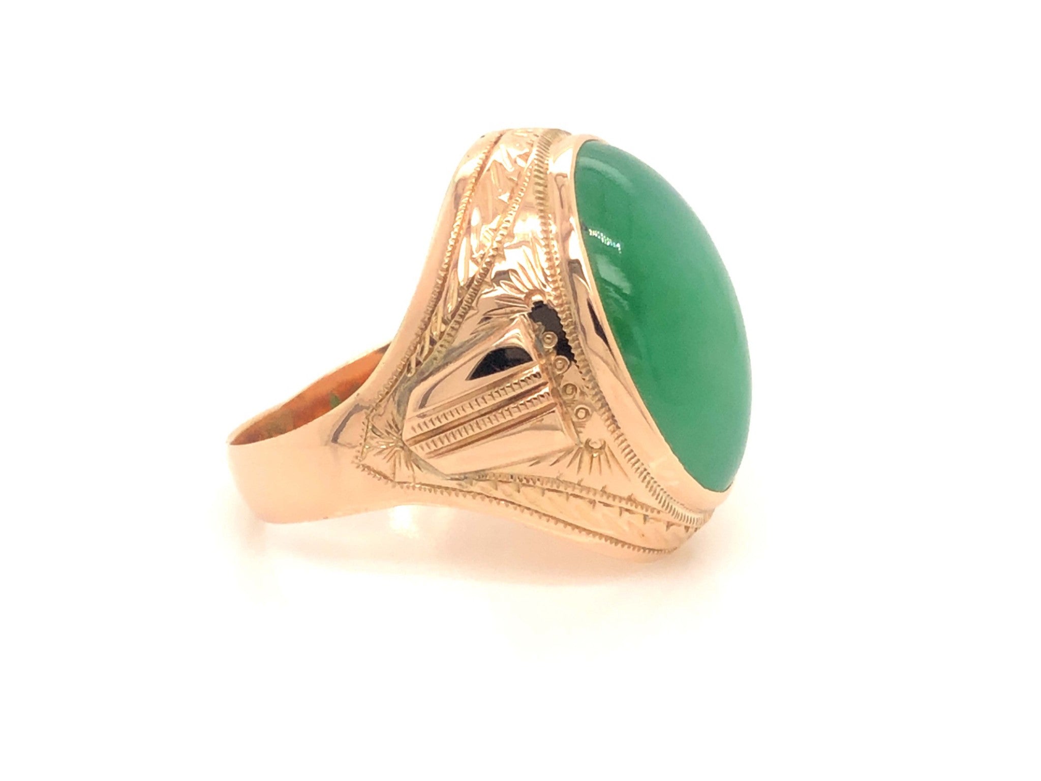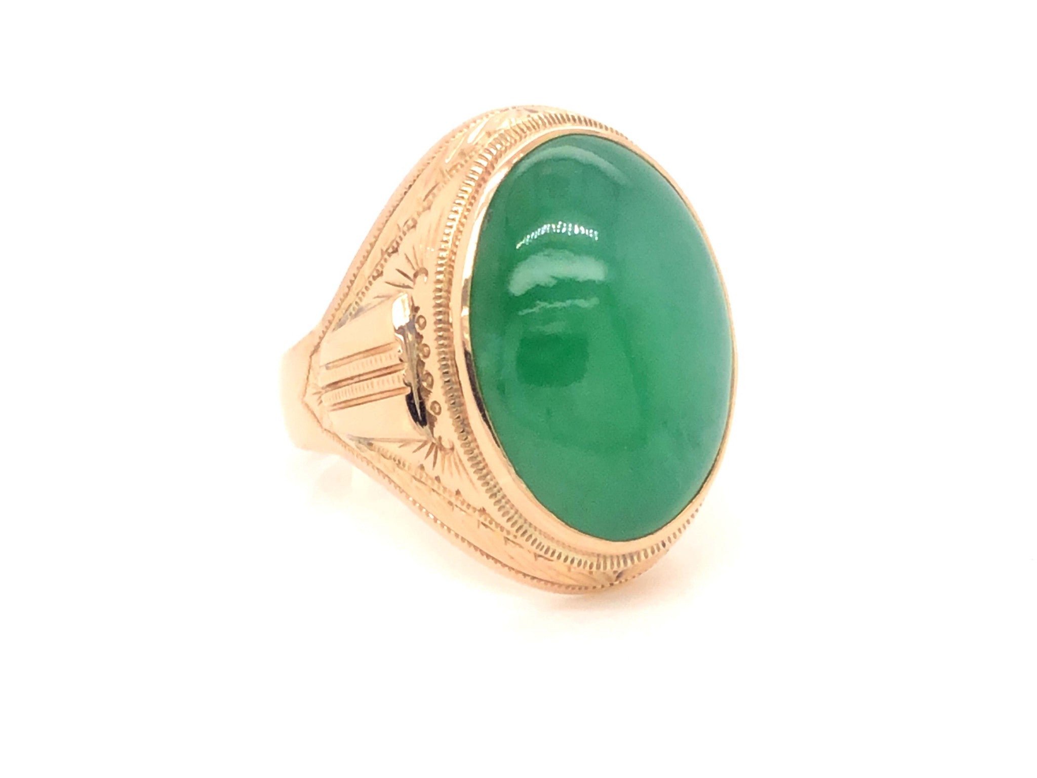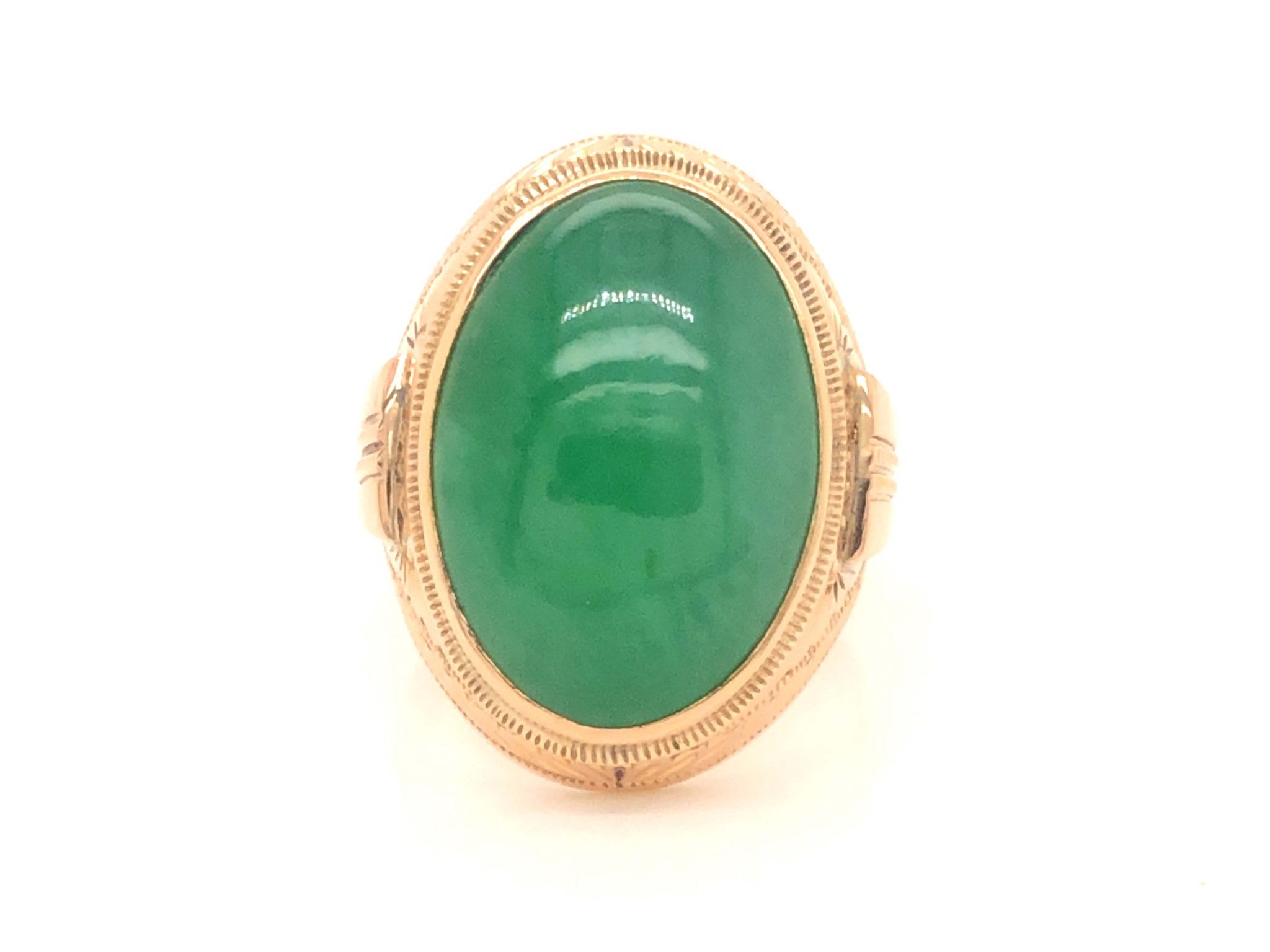 Magnificent vintage oval cabochon green jadeite jade ring, in 14k yellow gold. The beautiful apple green Jade is bezel set and measures approximately 20.4 mm x 14.5 mm x 8.27 mm. The ring is 25 mm long and 20 mm wide. The ring has an Art Deco decorated tapered shank with a high polish finish. The ring is size 8.75 and can be easily re-sized for a small fee. Stamped "14k" on the inside. Total weight is 13.7 grams. Preowned in very good condition.