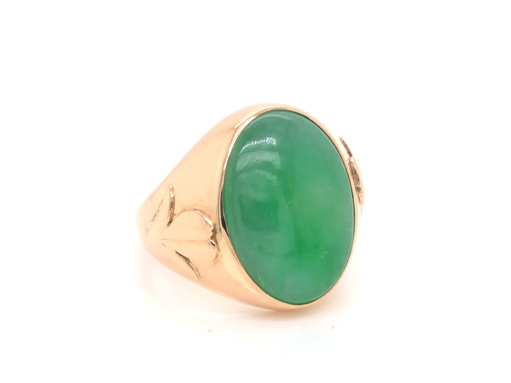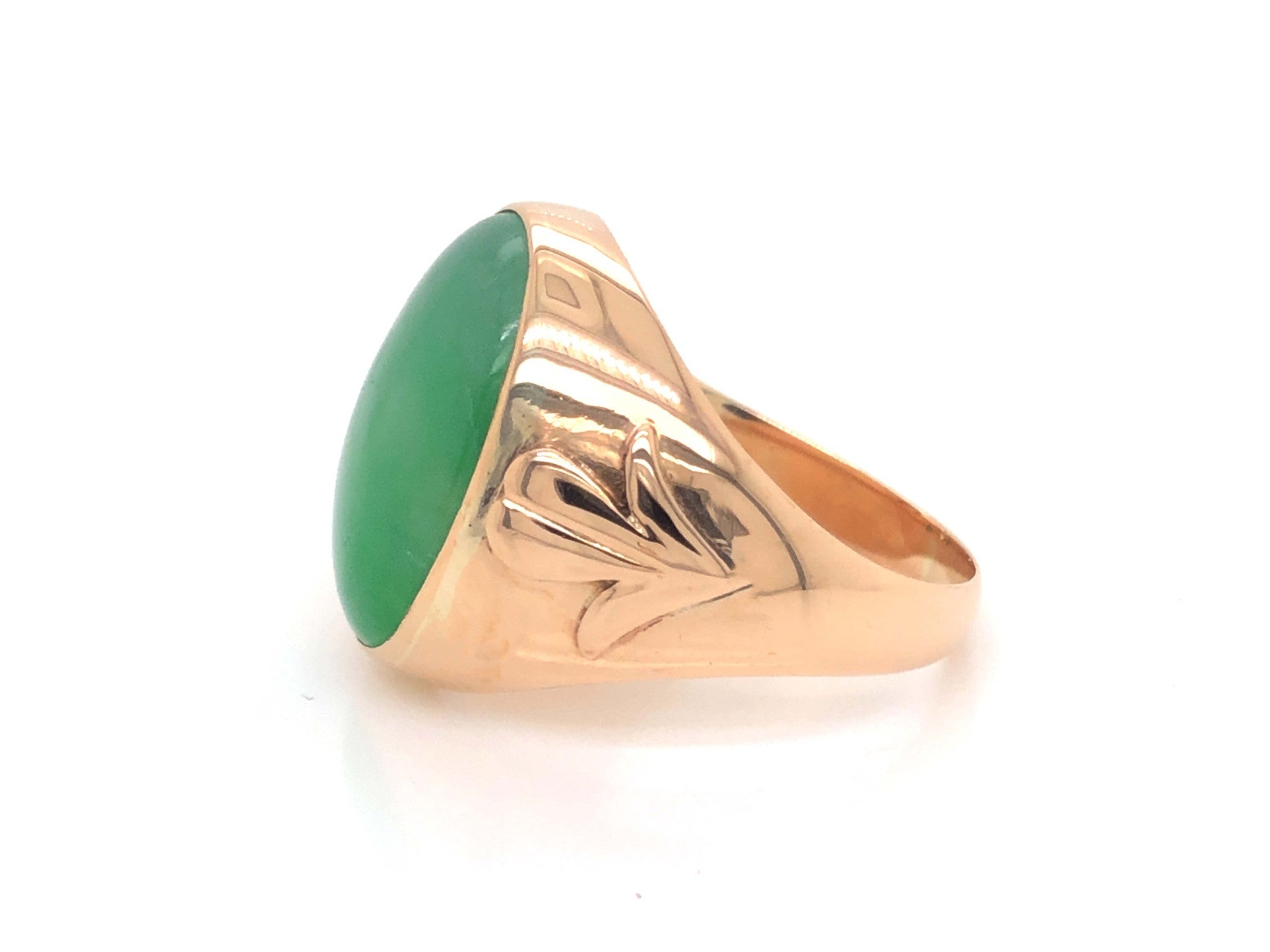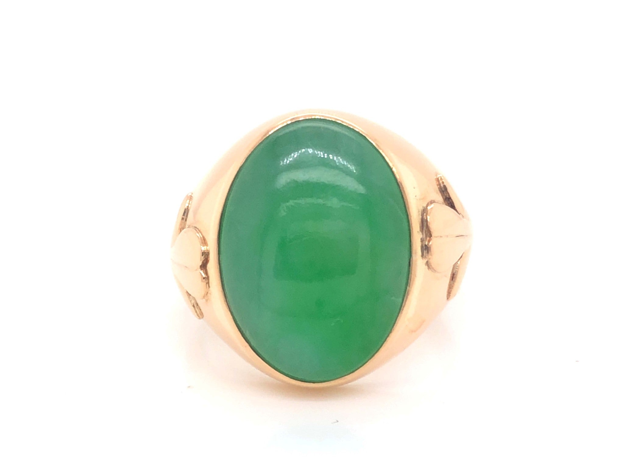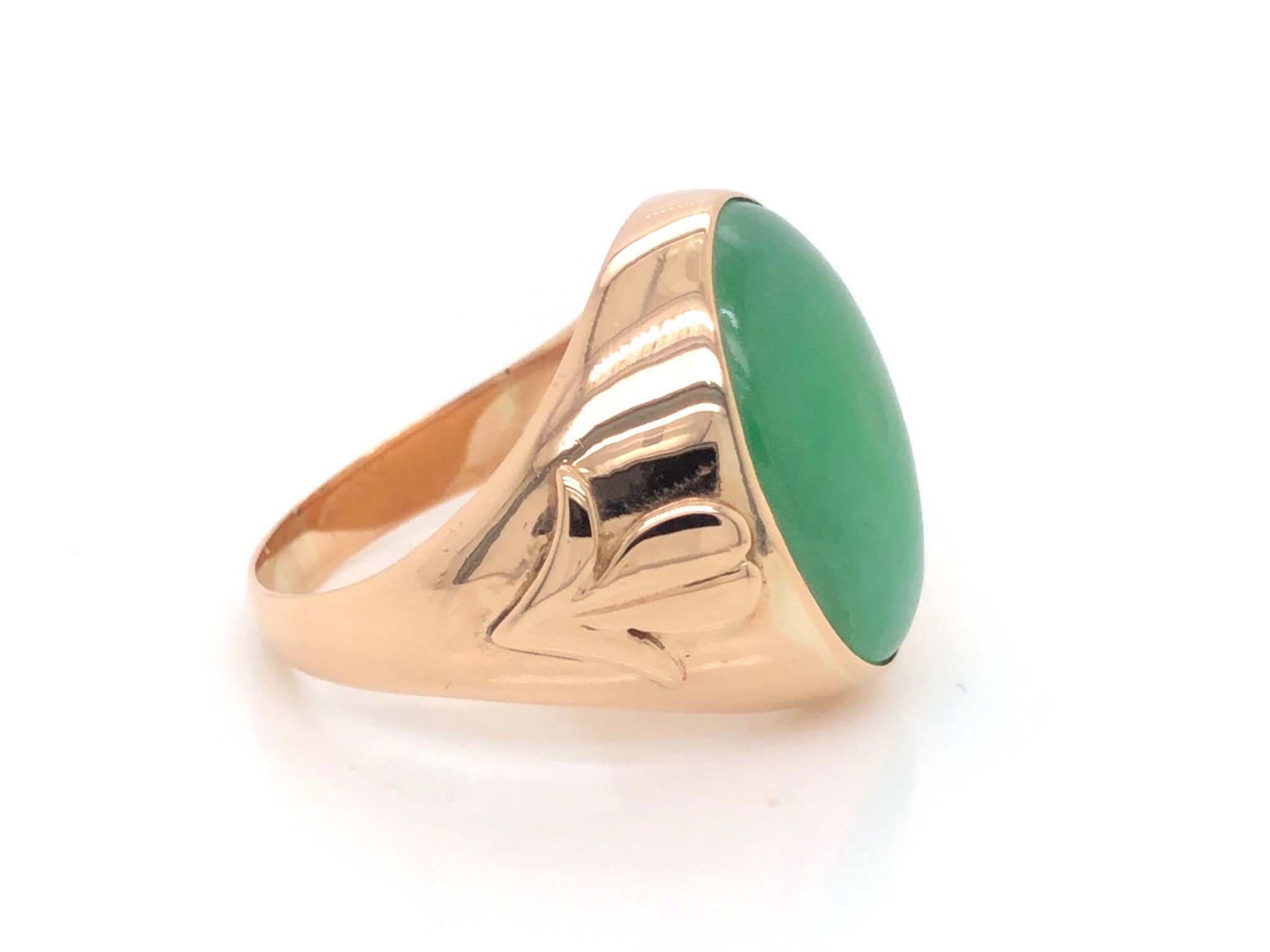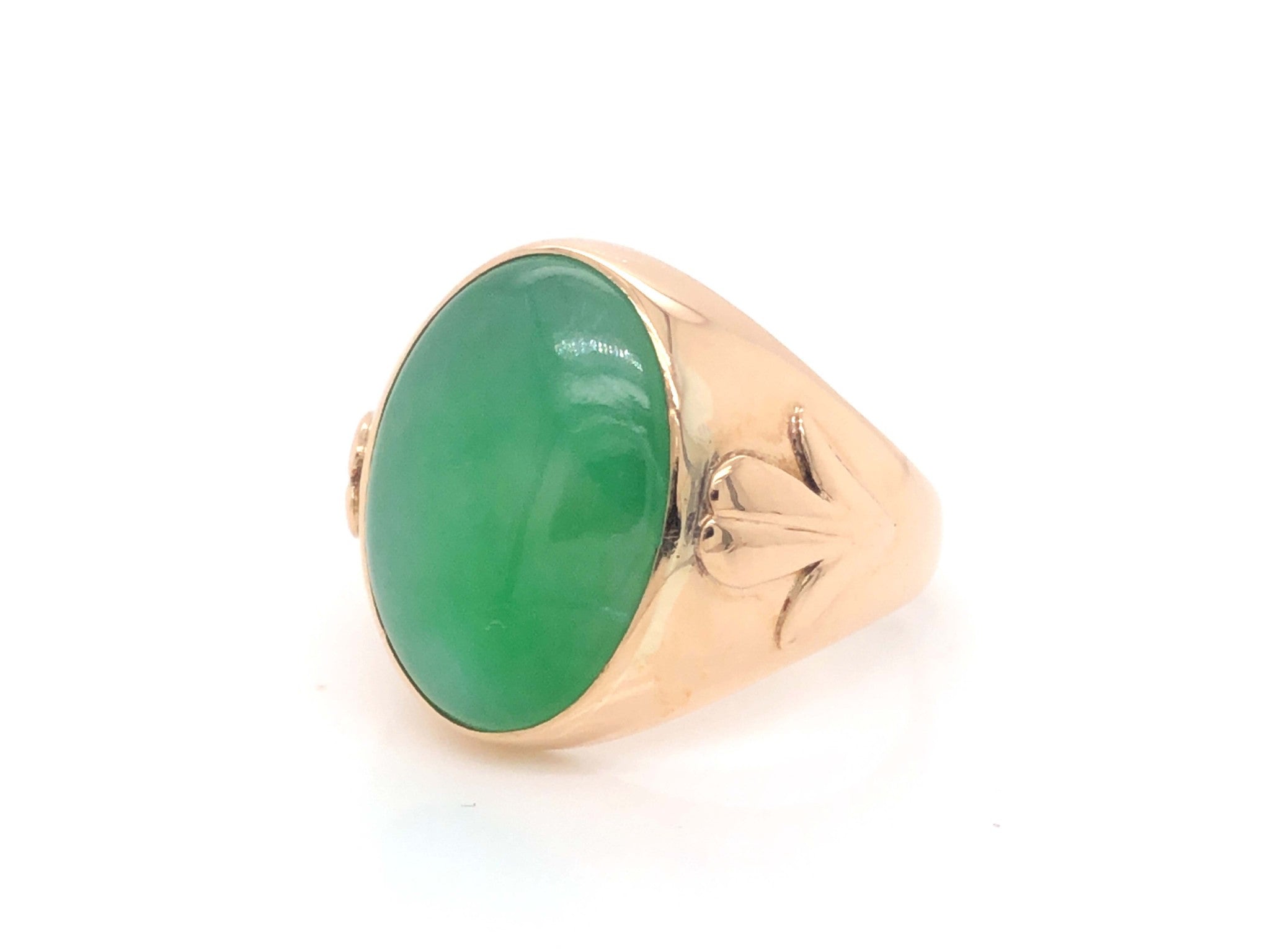 Magnificent vintage oval cabochon green jadeite jade ring, in 14k yellow gold. The beautiful apple green Jade is bezel set and measures approximately 19.79 mm x 14.49 mm x 6.40 mm. The ring has a tapered shank with a high polish finish and a floral design on both shoulders. The ring is size 10.75 and can be easily re-sized for a small fee. Stamped "14k" on the inside. Total weight is 11.4 grams. Preowned in very good condition.