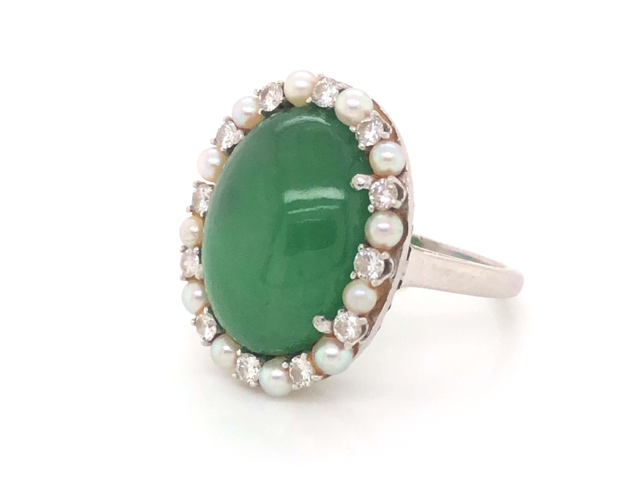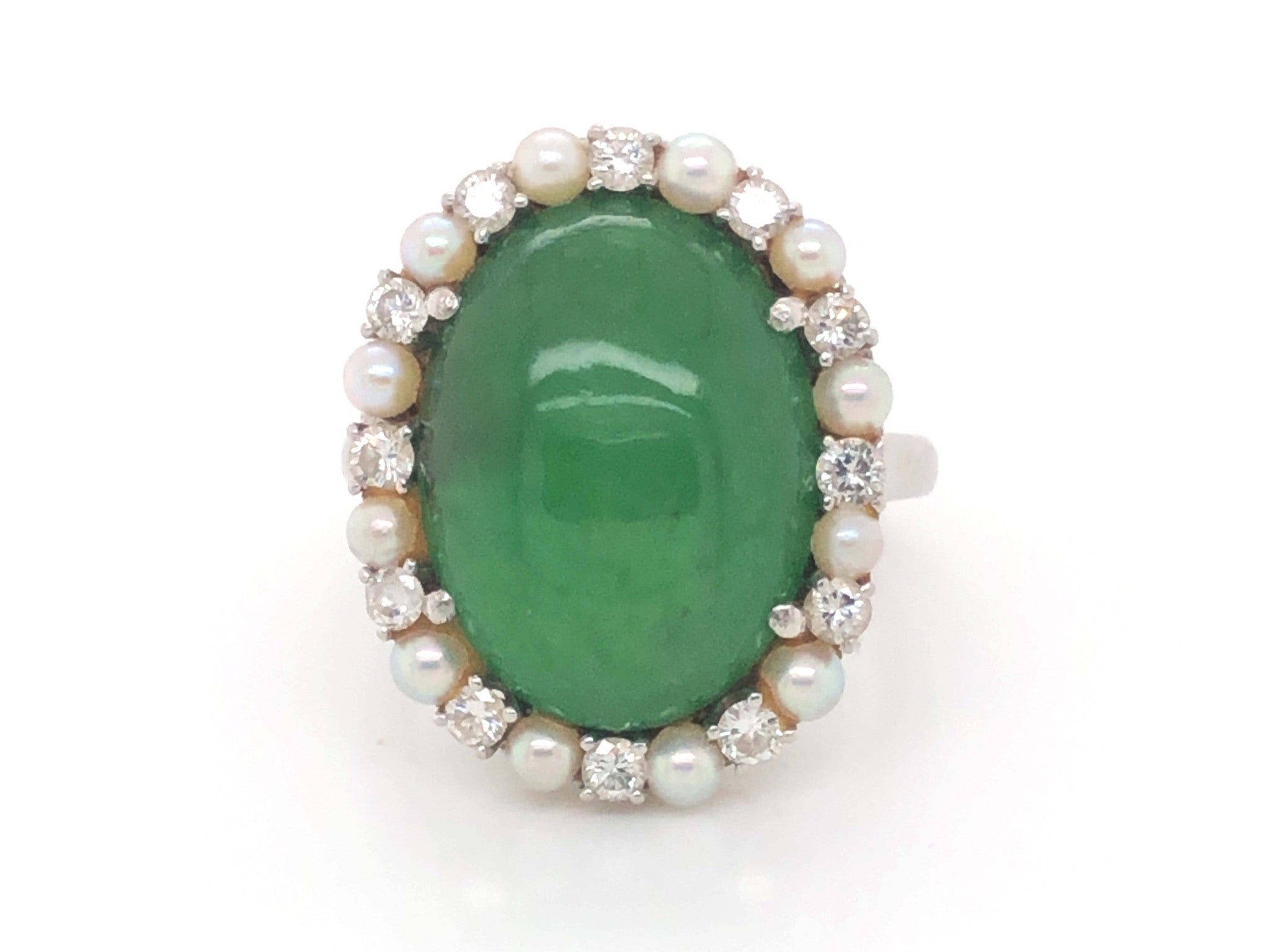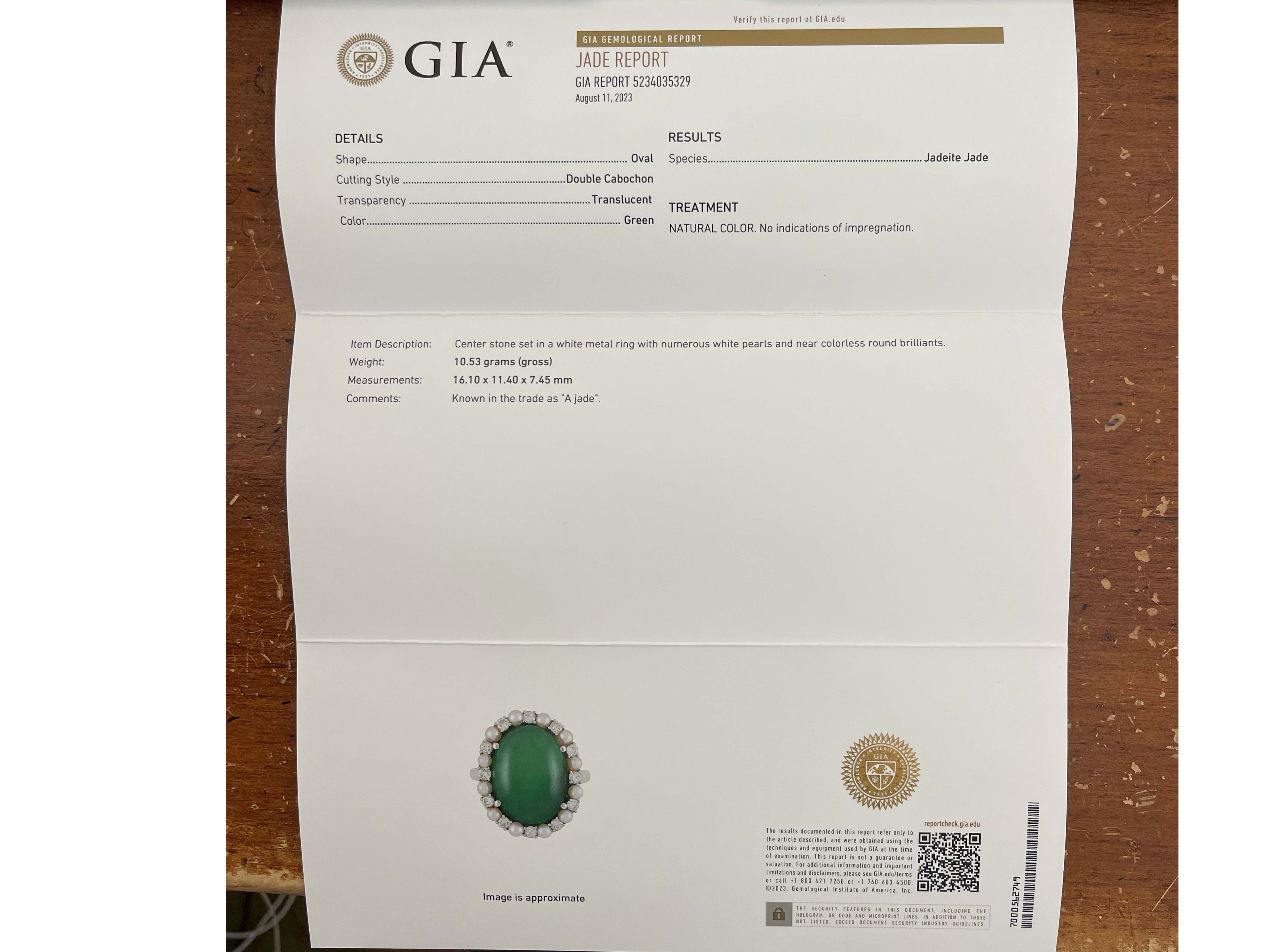 Vintage Oval Double Cabochon Green Jadeite Jade Pearl and Diamond Halo Ring in Platinum. Oval shape double cabochon green jadeite jade with a pearl and diamond halo. Comes with GIA report #:5234035329. Order will include original GIA report. The Jade is set in 4 prongs and measures approximately 16.10 mm x 11.40 mm x 7.45 mm with an estimated weight of 9.39 carats. The ring has 12 diamonds totaling ~0.60 carat, G-H in color and VS in clarity. The ring features 12 seed pearls. The ring is ~20.90mm x 17.02 mm. The ring is size 4.75 and can be easily resized. Total weight is 10.5 grams. Preowned in very good condition.