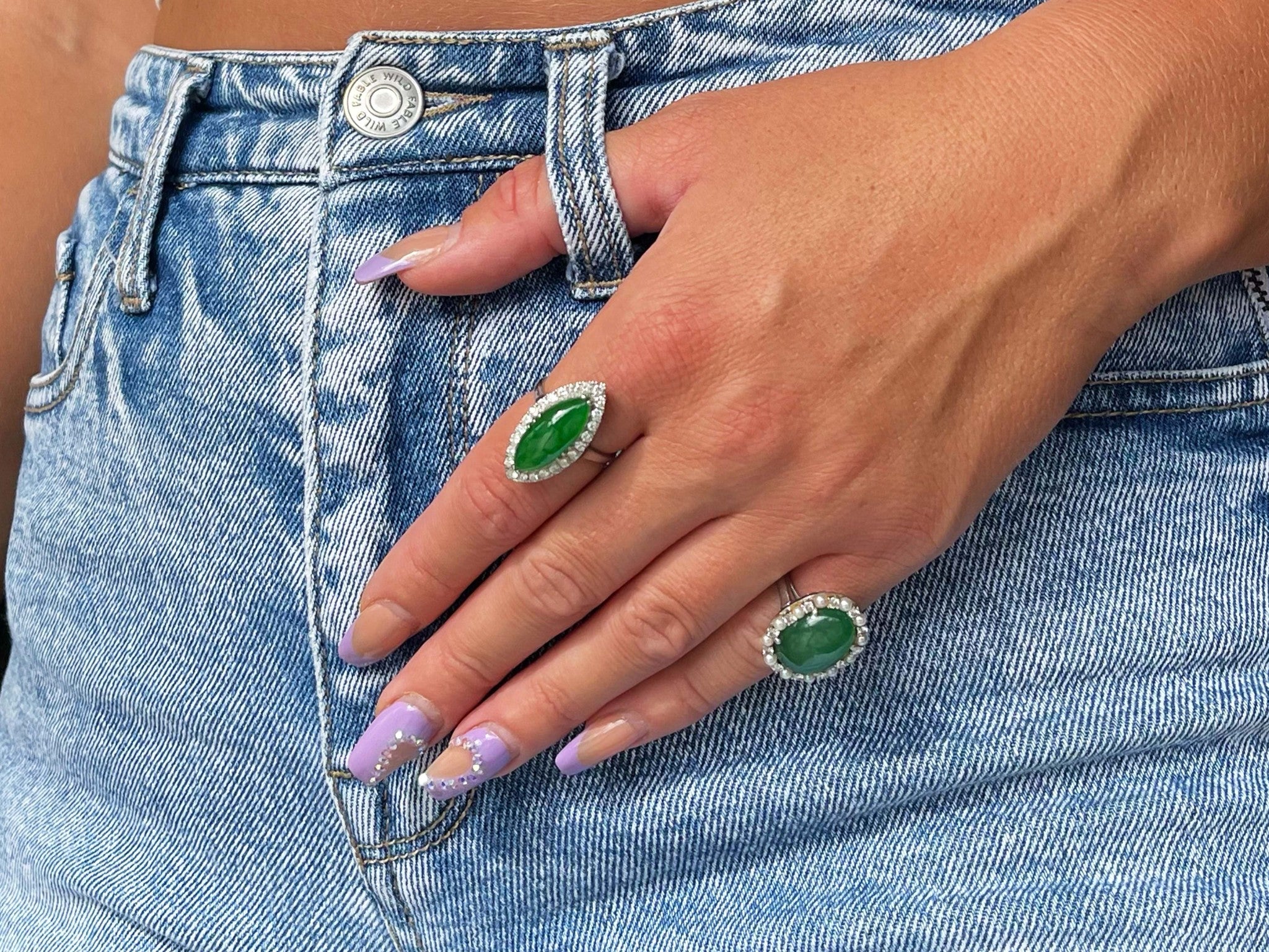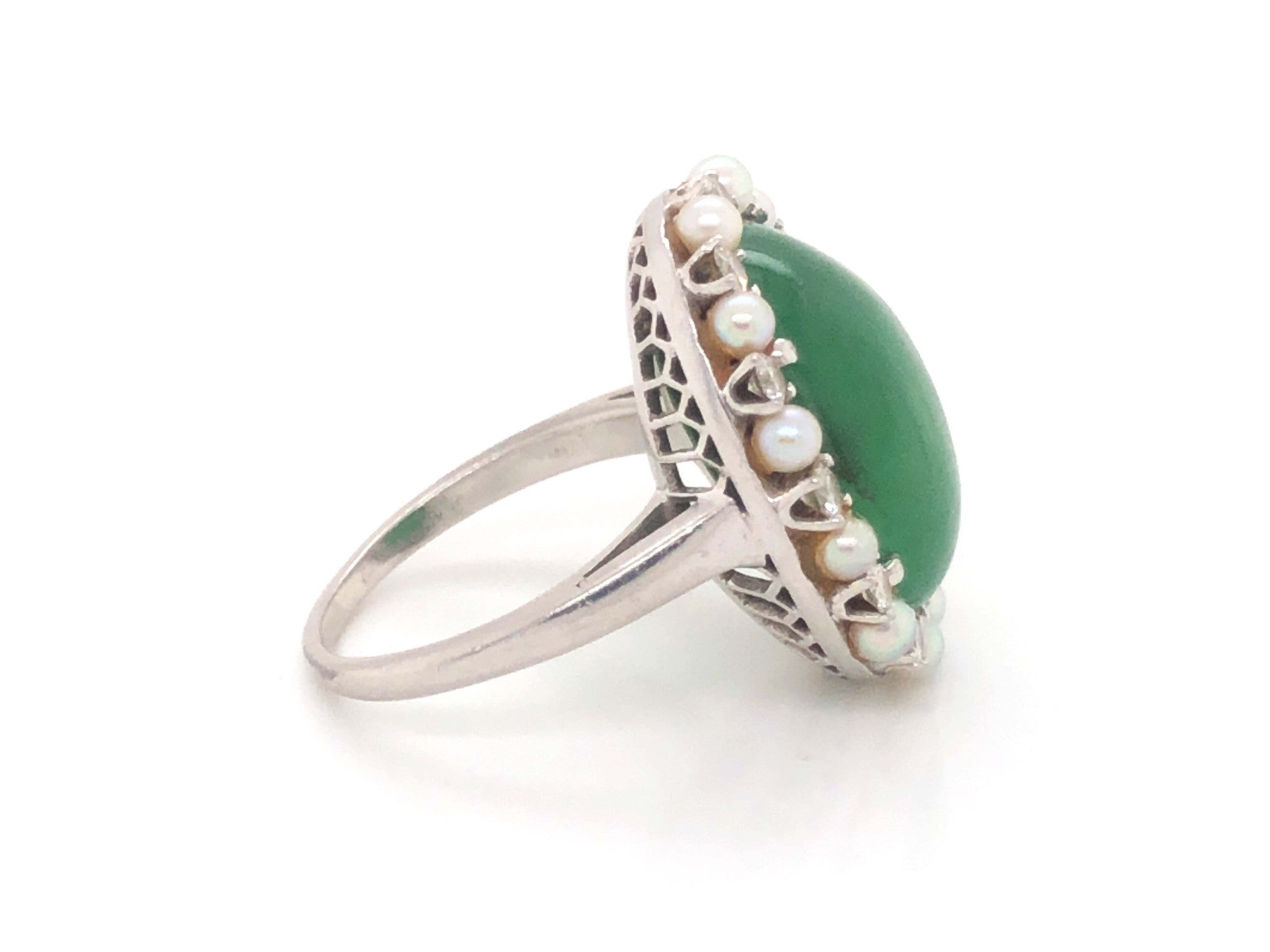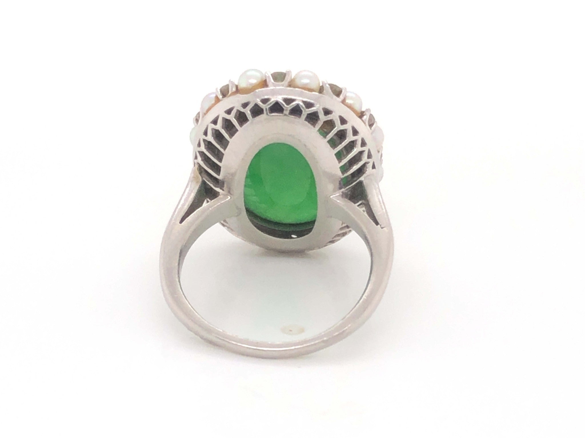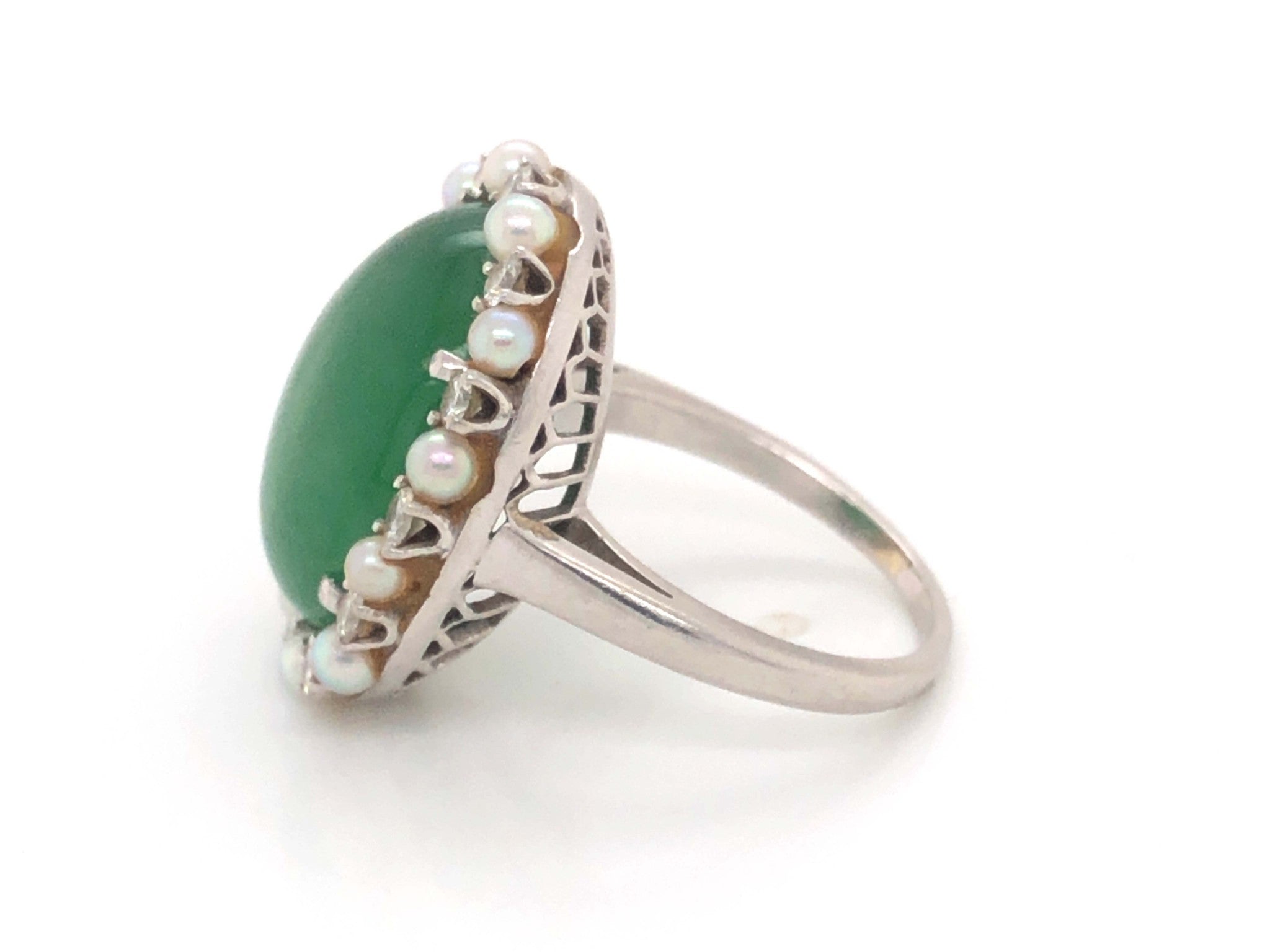 Vintage Oval Double Cabochon Green Jadeite Jade Pearl and Diamond Halo Ring in Platinum. Oval shape double cabochon green jadeite jade with a pearl and diamond halo. Comes with GIA report #:5234035329. Order will include original GIA report. The Jade is set in 4 prongs and measures approximately 16.10 mm x 11.40 mm x 7.45 mm with an estimated weight of 9.39 carats. The ring has 12 diamonds totaling ~0.60 carat, G-H in color and VS in clarity. The ring features 12 seed pearls. The ring is ~20.90mm x 17.02 mm. The ring is size 4.75 and can be easily resized. Total weight is 10.5 grams. Preowned in very good condition.