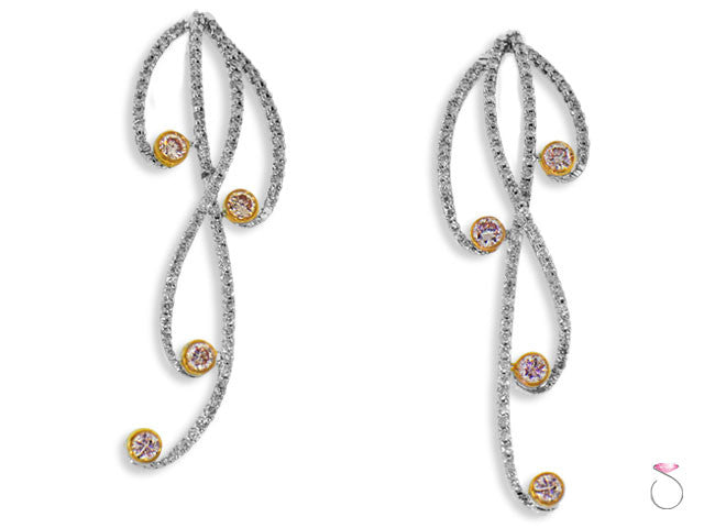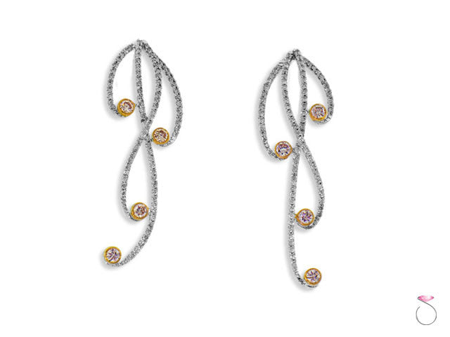 A contemporary, artistic pair of waterfall drop earrings in solid 18K white gold, featuring 0.85ct diamonds pave set in 18K white gold and 0.40ct pink diamonds set on a matching 18K rose gold bezel set. The total diamonds in the earrings is 1.25ct.Earrings Details:
